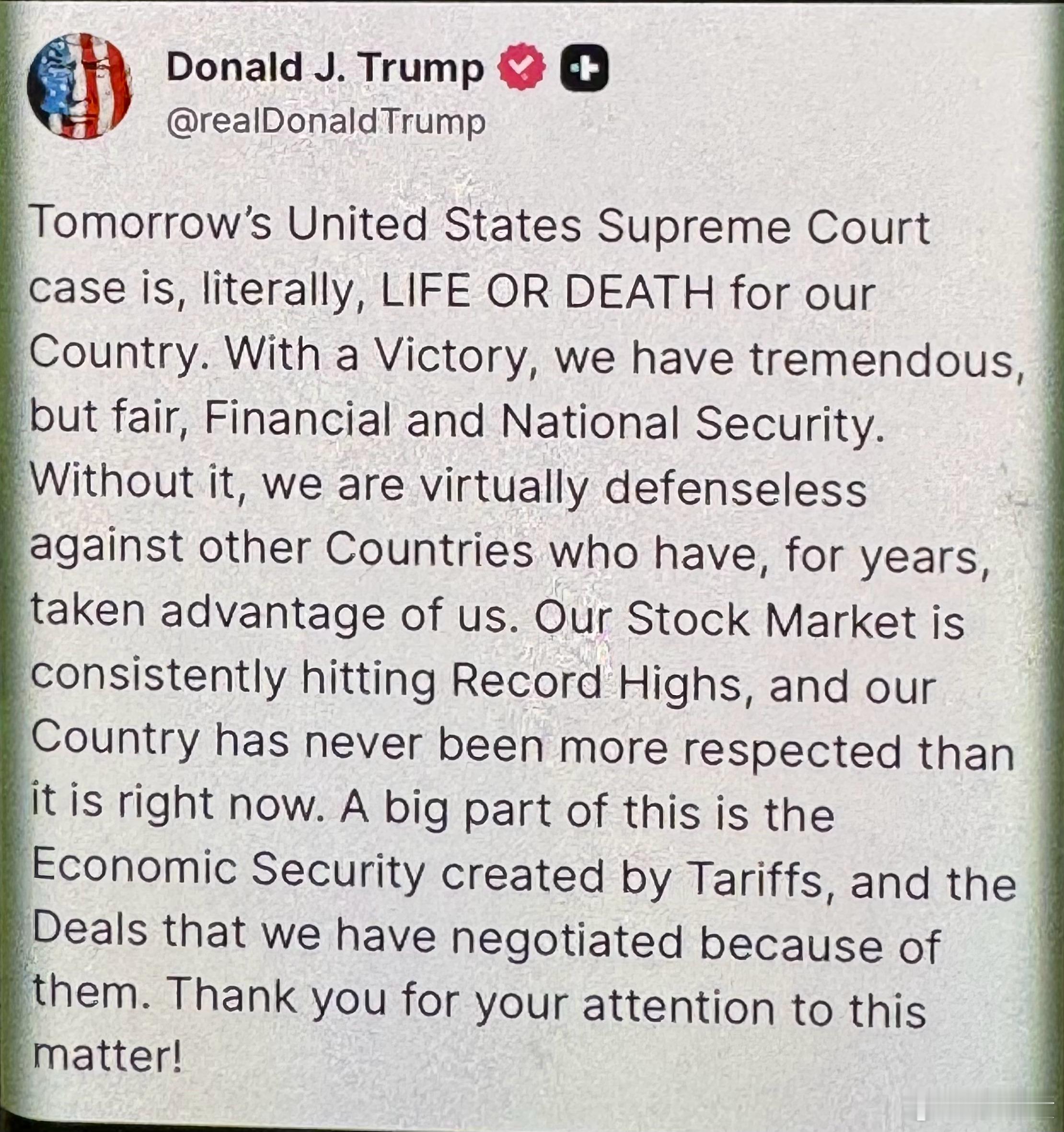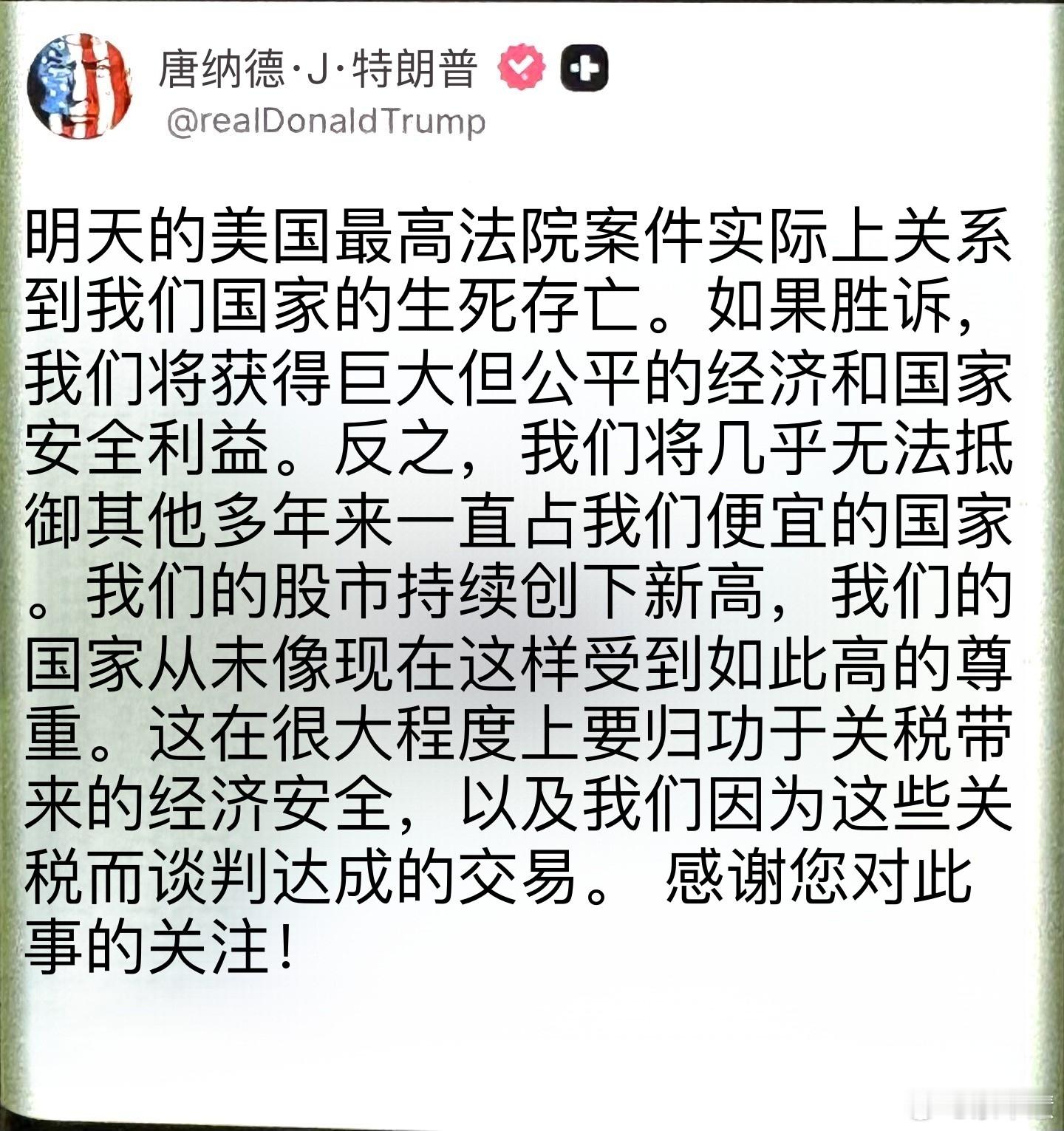 重磅!突发!特朗普真急了啊!“明天的美国最高法院案件,从字面上看,是我们国家的生死存亡。如果取得胜利,我们将获得巨大但公平的财政和国家安全。没有它,我们几乎无法抵御其他国家…”——美国总统唐纳德·特朗普!特朗普关税