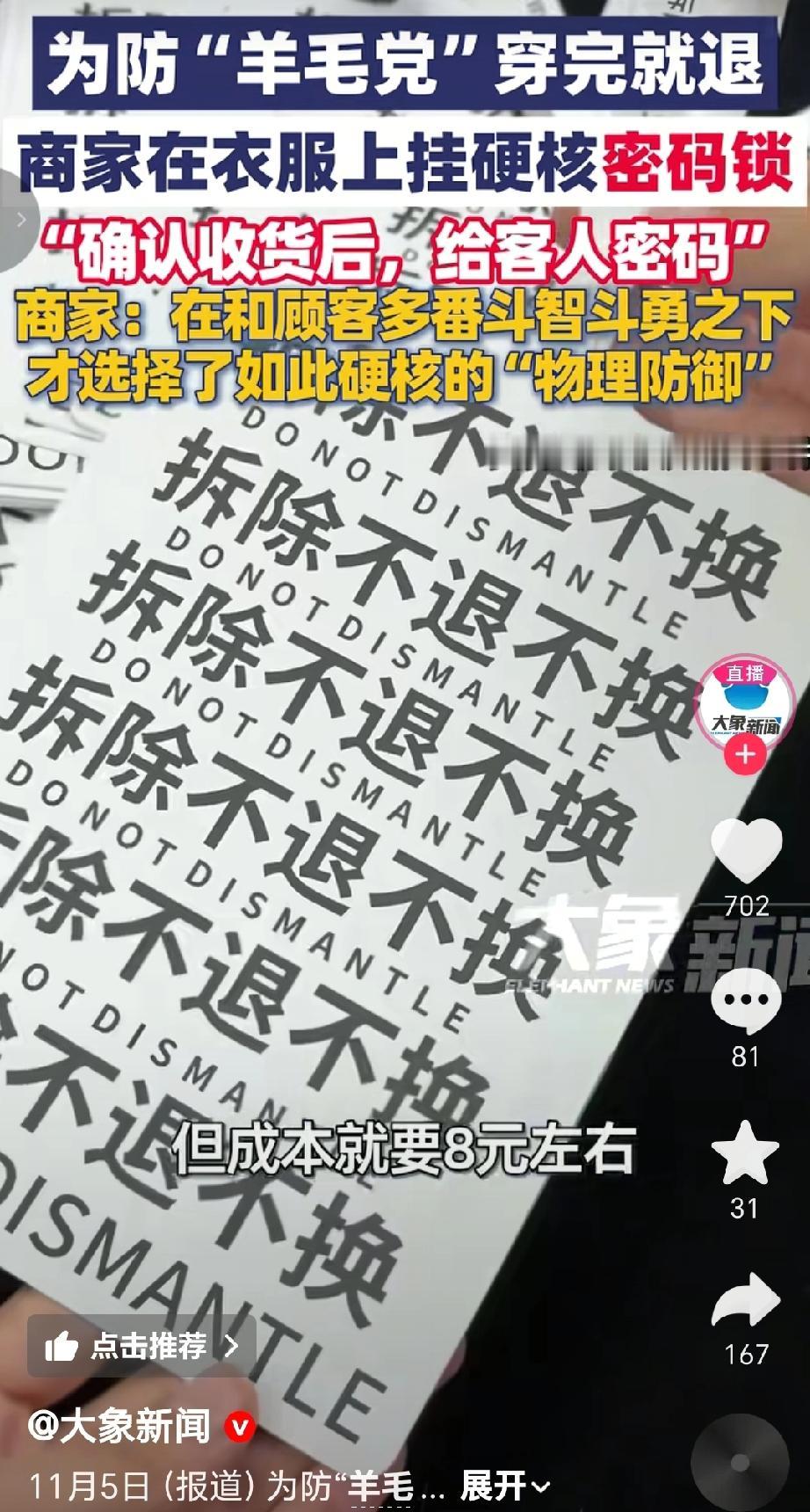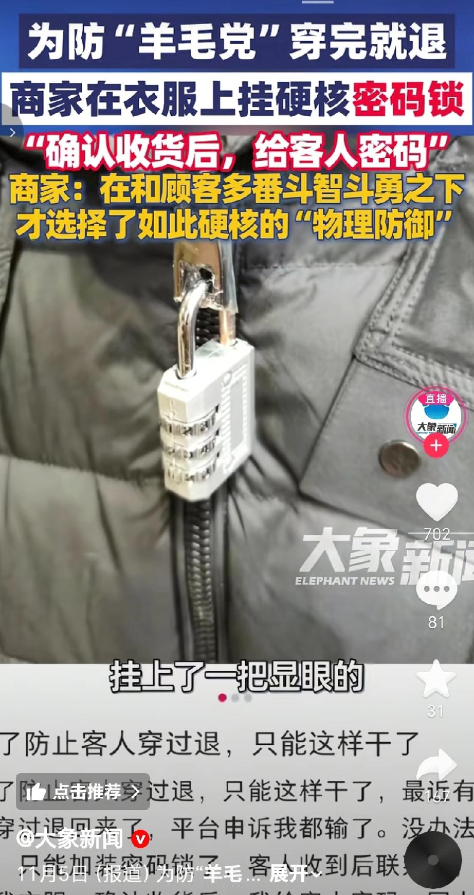 在双十一促销期间,部分消费者利用7天无理由退货条款,短期穿戴网购的衣服后就退货,这种“薅羊毛”现象引发关注。为了遏制顾客短期穿戴后退货,北京一服装商家在衣服拉链上挂上显眼的三位数密码锁,确认收货后才给客人密码。商家表示,这是在和顾客多番“斗智斗勇”后选择的硬核“物理防御”。此前商家用过巨型吊牌防退货,但成本要8元左右且效果不佳,而密码锁花费不到3元,商家仅在利润大的商品上使用。(来源于@大象新闻)