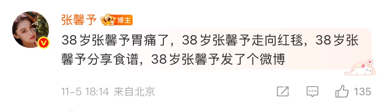 还在评论发了一条:“38岁张馨予胃痛了,38岁张馨予走向红毯,38岁张馨予分享食谱,38岁张馨予发了个微博”