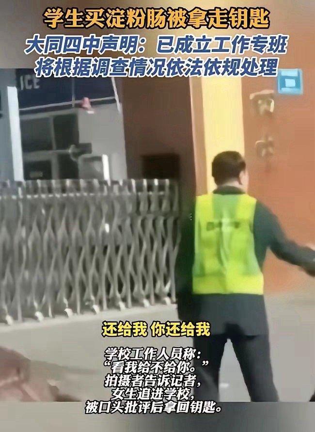视频内容是11月1日中午,山西大同四中门口,一位女学生放学后在校门口买一根淀粉肠。随后,学校工作人员冲出学校,将学生的电动车钥匙抢走。