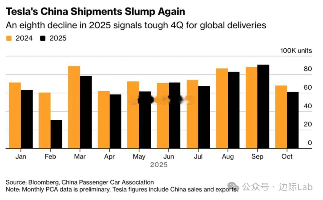 根据乘用车市场信息联席会的初步数据,特斯拉上海工厂10月份的出货量(含出口与内销)同比下降近10%,至61,497辆,这是其2025年以来第八次录得同比下滑。此次下滑发生在该公司为提振需求而推出续航缩减、配置简化的低价版新车型之际,同时也反映出其在全球范围面临的增长放缓压力,包括欧洲市场需求疲软及美国税收抵免政策结束后的不确定性。相较之下,中国新能源汽车市场整体在10月同比增长16%。