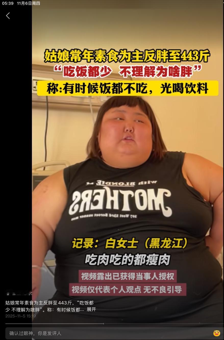 刷到一姑娘胖到443斤,说自己吃的不多,一顿两个馒头,两碗米饭。吃素,不咋吃肉。