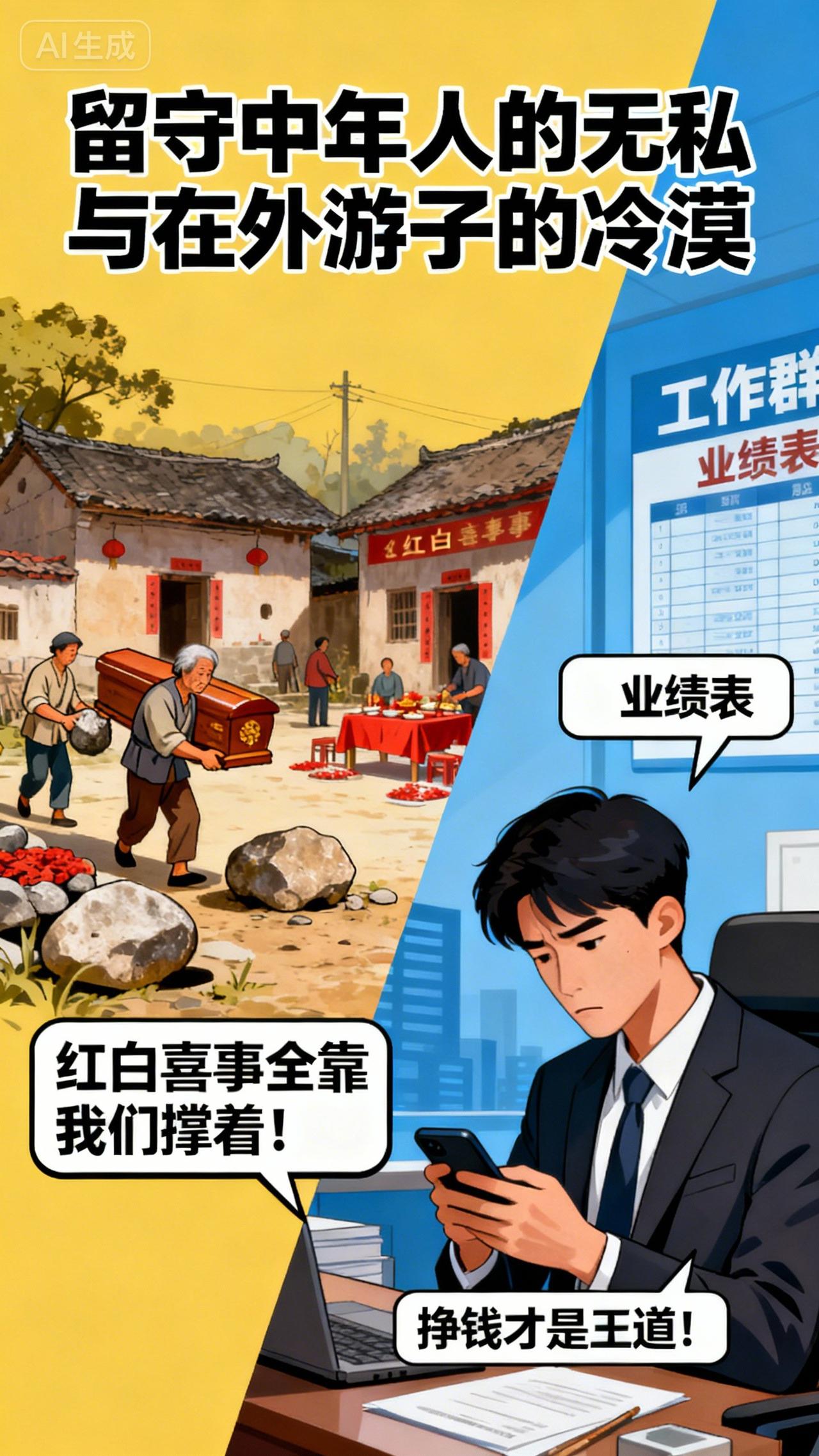 今天在家族群里骂了那些不知好歹的在外打工年轻人,讲留守在农村老家的中年人。如果没有这些人还在村里,你家出点事没有任何人邦忙,特别是红白喜事,他们放下手中活,无偿邦忙几天,你们在外挣钱,别人家有事你没邦忙,你家有事,别人丢工去邦忙,凭良心讲,大家在外做牛马挣几个钱,也不给别人几分钱,别人也不要你几分钱,有什么炫耀的,各吃各家的饭,我最佩服这种无私邦忙兄弟们,最鄙视有了几个钱在家装大爷的,族里老人去世,从不抬棺材,连石头不搬的人农村空巢现象 农村人不要说 打工返乡人 农村老辈 老家骂街 村打工人 留守乡镇青年