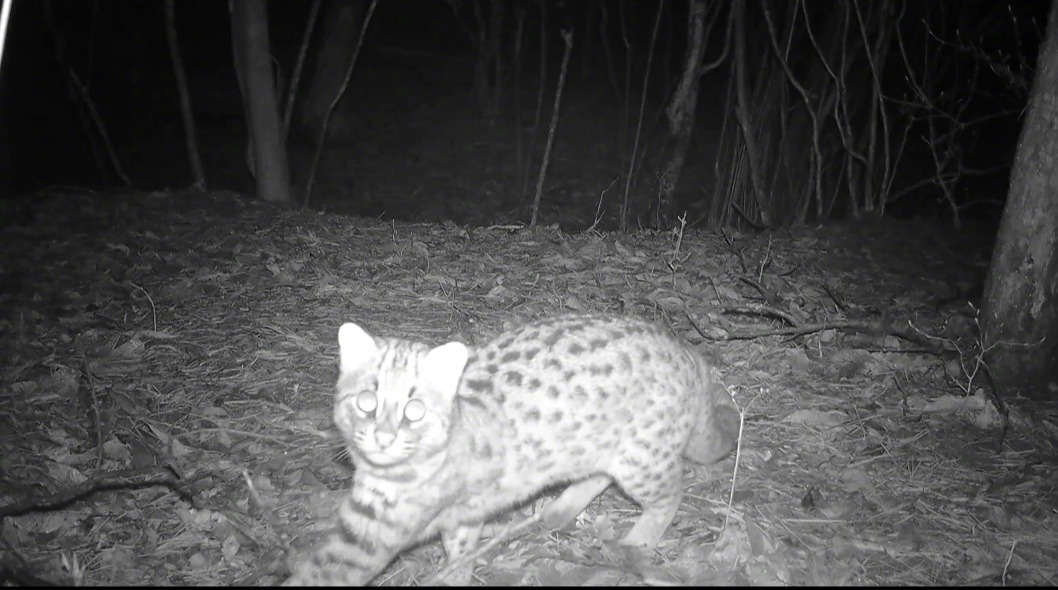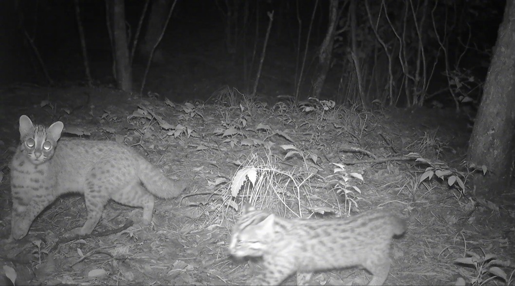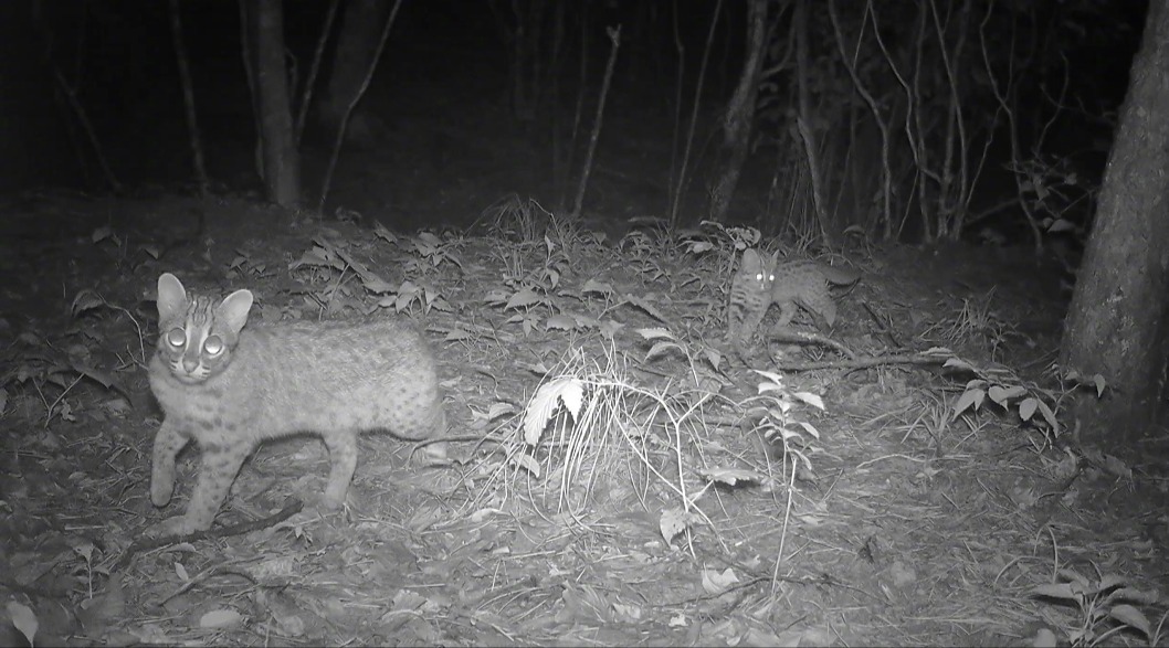【#安徽清凉峰豹猫带4月大宝宝被拍下#】#安徽绩溪县发现豹猫雌雄成幼个体#近日,绩溪县县域生物多样性本底调查工作组在整理绩溪清凉峰布设的红外相机影像资料时,发现国家二级重点保护野生动物豹猫的多组视频。在第一个视频中,一只雄性成年豹猫注意到红外相机并停留观察;第二个视频中,一只雌性豹猫带了一只约4个月大的幼猫出现在画面中,雌猫已注意到红外相机,但幼猫显然活泼爱动,并没有注意到相机。两组视频均在夜间拍摄,同地还拍摄到许多华南兔和鼠类,是豹猫的重要食物来源。(大皖新闻)