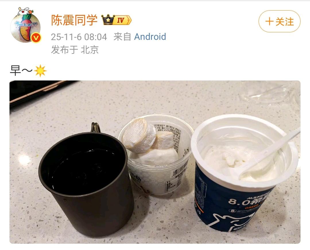 陈震:早~☀️ 陈震同学的早餐依旧非常的简单,别看他早饭这么简单,到晚餐就不简单了,必发吃肉图片。 还是大博主好呀,每天早上发一个打卡的图片,就能收获相应的流量。 各位是怎么看的?欢迎评论区留言。