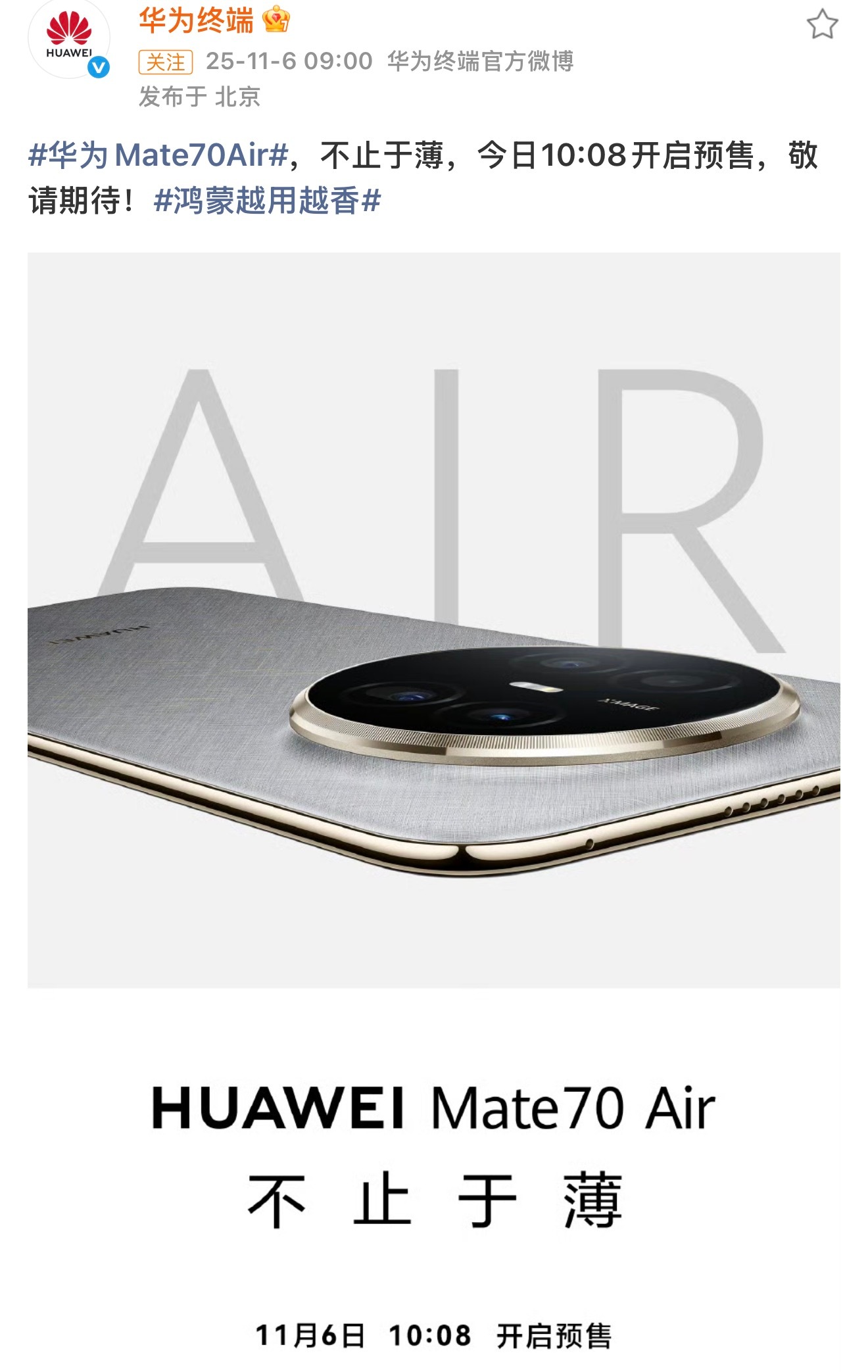 华为Mate70Air来了,直接预售[点赞]应该就是11号上市了