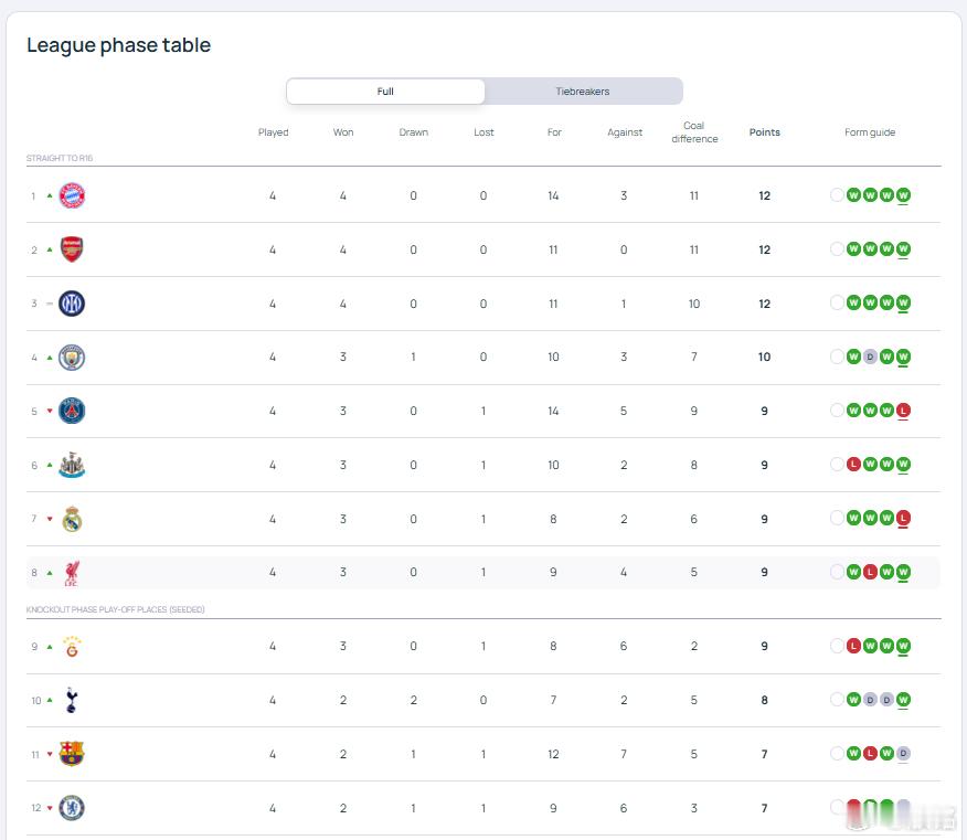欧冠 欧冠战罢4轮,前八里面有4个英超球队,阿森纳、曼城、纽卡斯尔、利物浦。