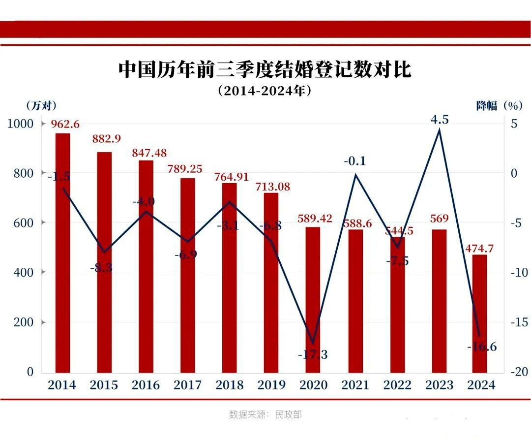如图,515.2万对还是不如2023年与2022年。2024年实在是太低了,有点年轻人逆反的意思,男女谈崩了,不结了。