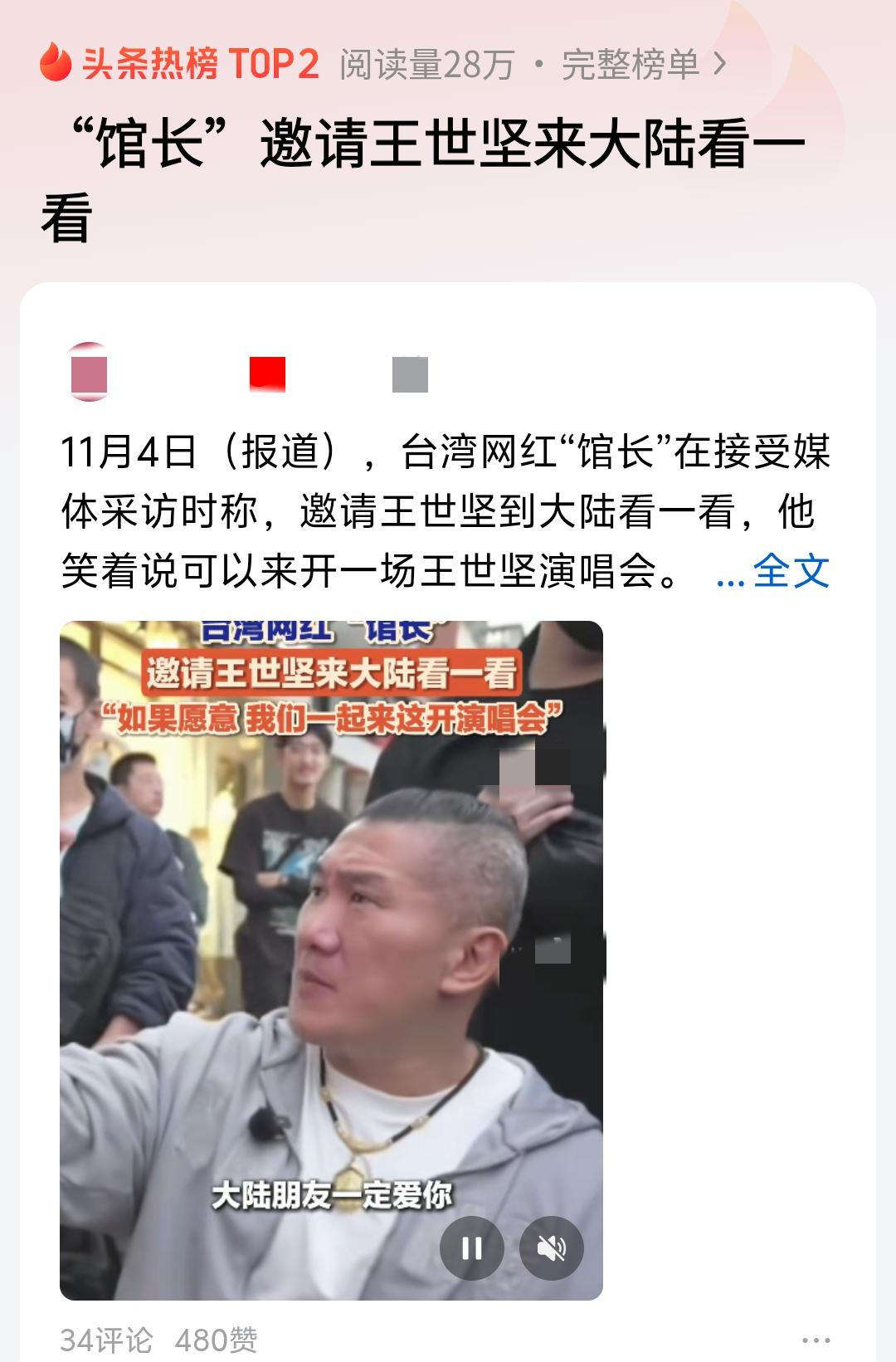 王世坚如果来大陆开演唱会,你会去捧场吗?11月4日,台湾网红“馆长”在接受媒体采访时称,他邀请王世坚到大陆看一看,还可以来开一场王世坚演唱会。不得不说馆长这个提议很好!当年韩国人朴载相能凭一曲《江南Style》走红全球,王世坚凭什么不能用一首《没出息》闪亮出道?虽然王世坚身在绿营,但他既然认可两岸“同文同种”,就是值得给予善意的。要不来大陆开个巡回演唱会吧,用一曲《没出息》唱响海峡两岸的有出息!