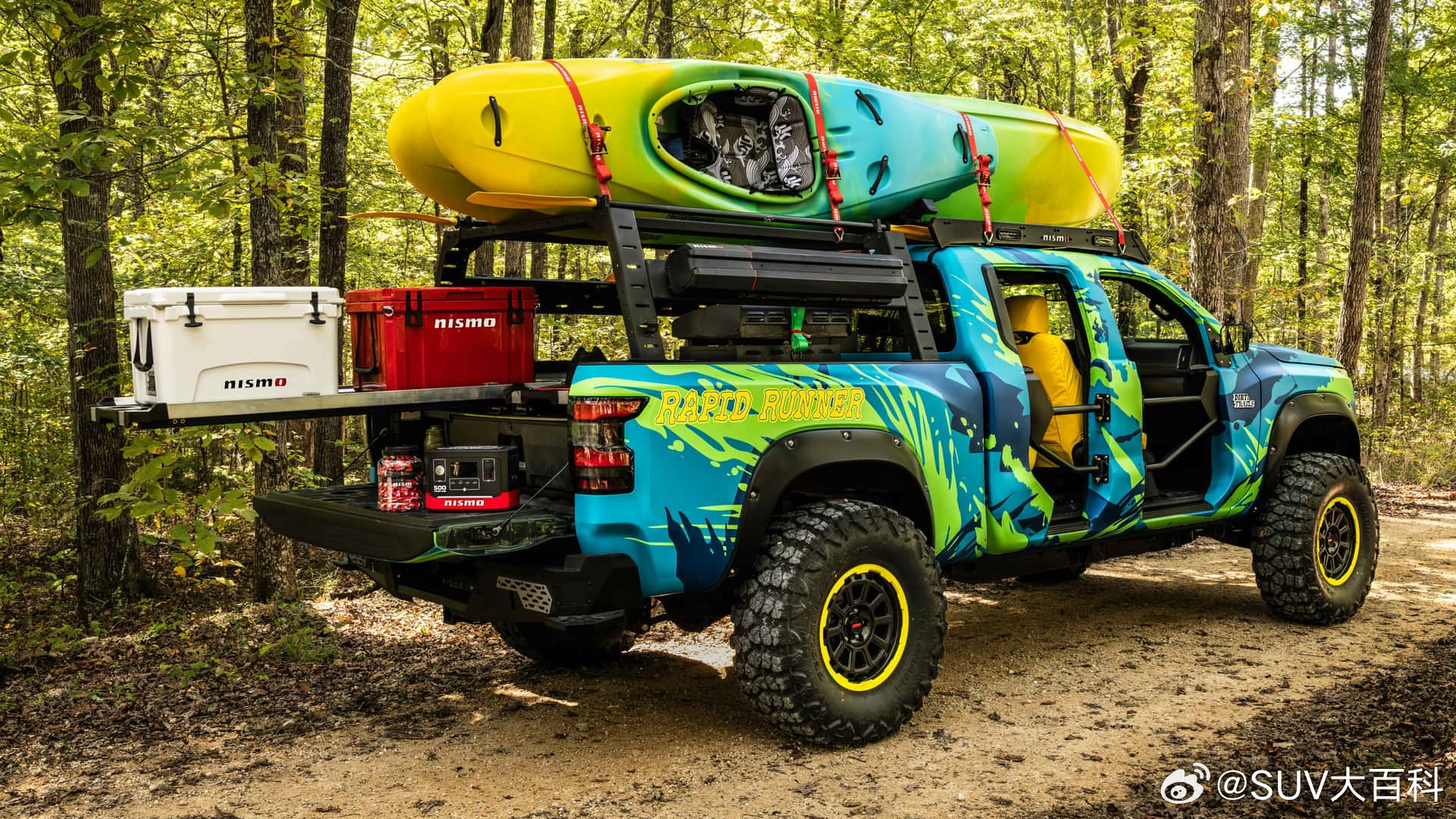 速跑者(Rapid Runner)-基于Frontier Pro-X打造,由Powernation TV操刀,面向泛舟玩家;配有涉水喉、自带下护板和拖车钩的前杠、钢制越野后杠、NISMO车顶行李架(含三面探照灯)、车顶轻艇架(最多四艘)、Bilstein减振、NISMO 17吋ASCEND轮圈+37吋优科豪马Geolander MT越野胎、Titan皮卡后桥以及轮距加宽、悬架升高2吋