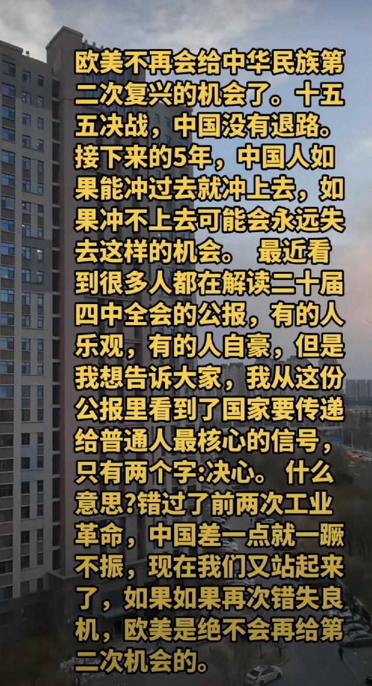 欧美不会给中华民族第二次复兴的机会了,中国没有退路,狭路相逢勇者胜,“决心”才是关键 第一次工业革命的技术成果在近代中国虽未大规模普及,但为后续工业化奠定了认知基础,第二次工业革命的核心技术,中国在新中国成立后通过自主研发与技术引进,逐步建立了完整的工业体系,为后续发展筑牢了根基。 当前世界正处于新一轮科技革命和产业变革的关键期,人工智能、新能源、生物技术等,这些正是中国实现跨越式发展的重要窗口。中国在5G通信、高铁、新能源汽车、光伏、量子计算等领域已取得全球领先成果,这些都不是“西方给予”的机会,而是中国凭借自身制度优势、庞大市场、人才储备和持续创新争取到的发展主动权。 历史和现实都证明,中华民族的复兴从来不是依赖外部“给予”,而是靠一代又一代人的奋斗。从“两弹一星”到“嫦娥探月”,从脱贫攻坚到科技自立自强,中国始终在主动把握时代机遇,而非被动等待。当前,中国正以更开放的姿态融入全球创新网络,未来的发展空间和潜力,更将由我们自己创造。新一轮工业革命,中国不容错过,也不会错过。
