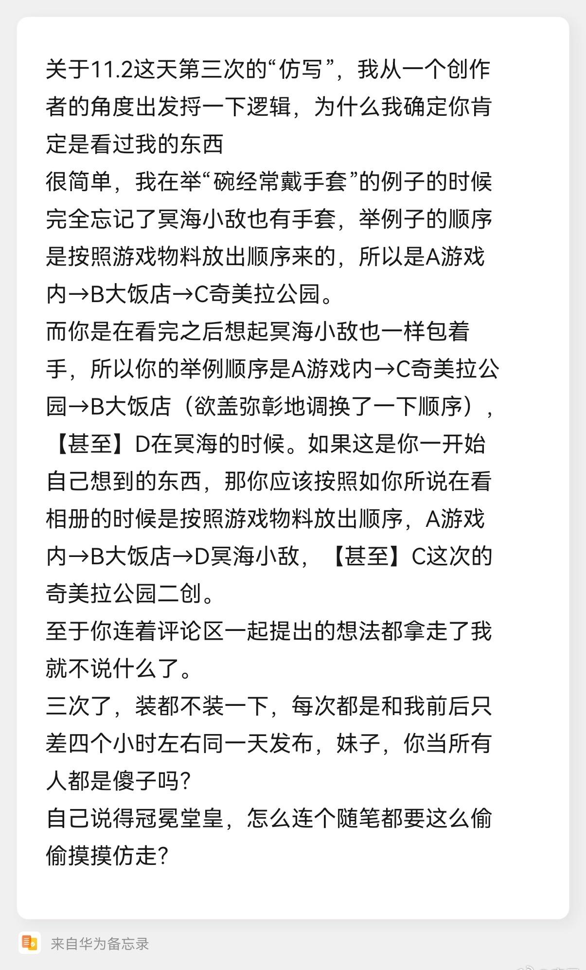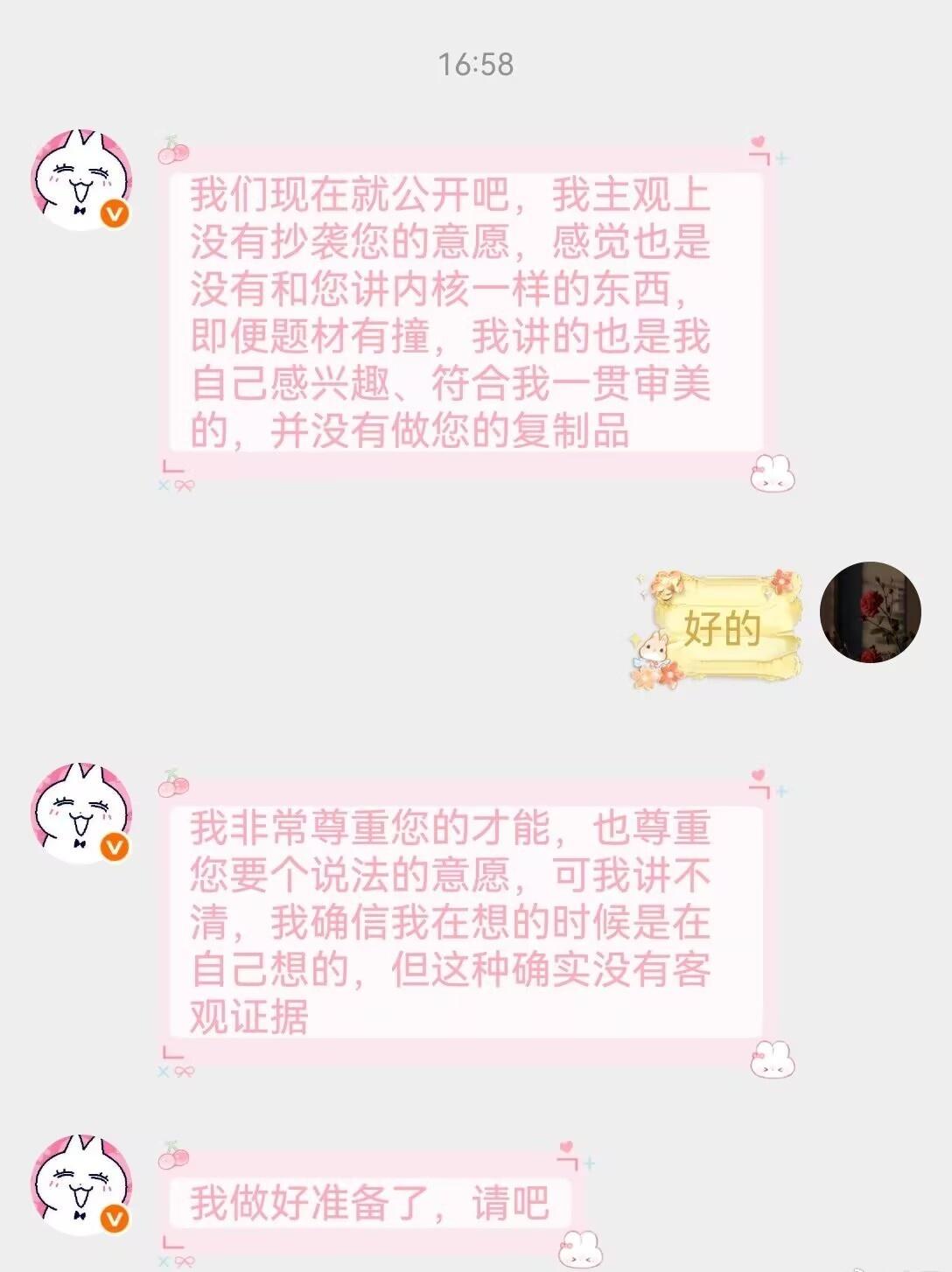 你的身心不健康不是由我造成的,这也不是什么挡箭牌,我说事不过三下不为例是留面子给你,没想到你倒是把自己哄好了,也行。第一次我就当是巧合,我什么都没说,安安静静把你拉黑了,但是三次了,每次都是同一天,前后只相隔四个小时,我实在说服不了自己这完全只是巧合,说出来只是为了不要再有第四次发生,我无意和你再有更多的冲突,也不希望演变成任何网暴事件,更不希望有任何人以我的名义去“讨说法”,总之,请你好自为之吧 最后2P附聊天沟通记录,对方最终也没有给出一个能让我信服的解释