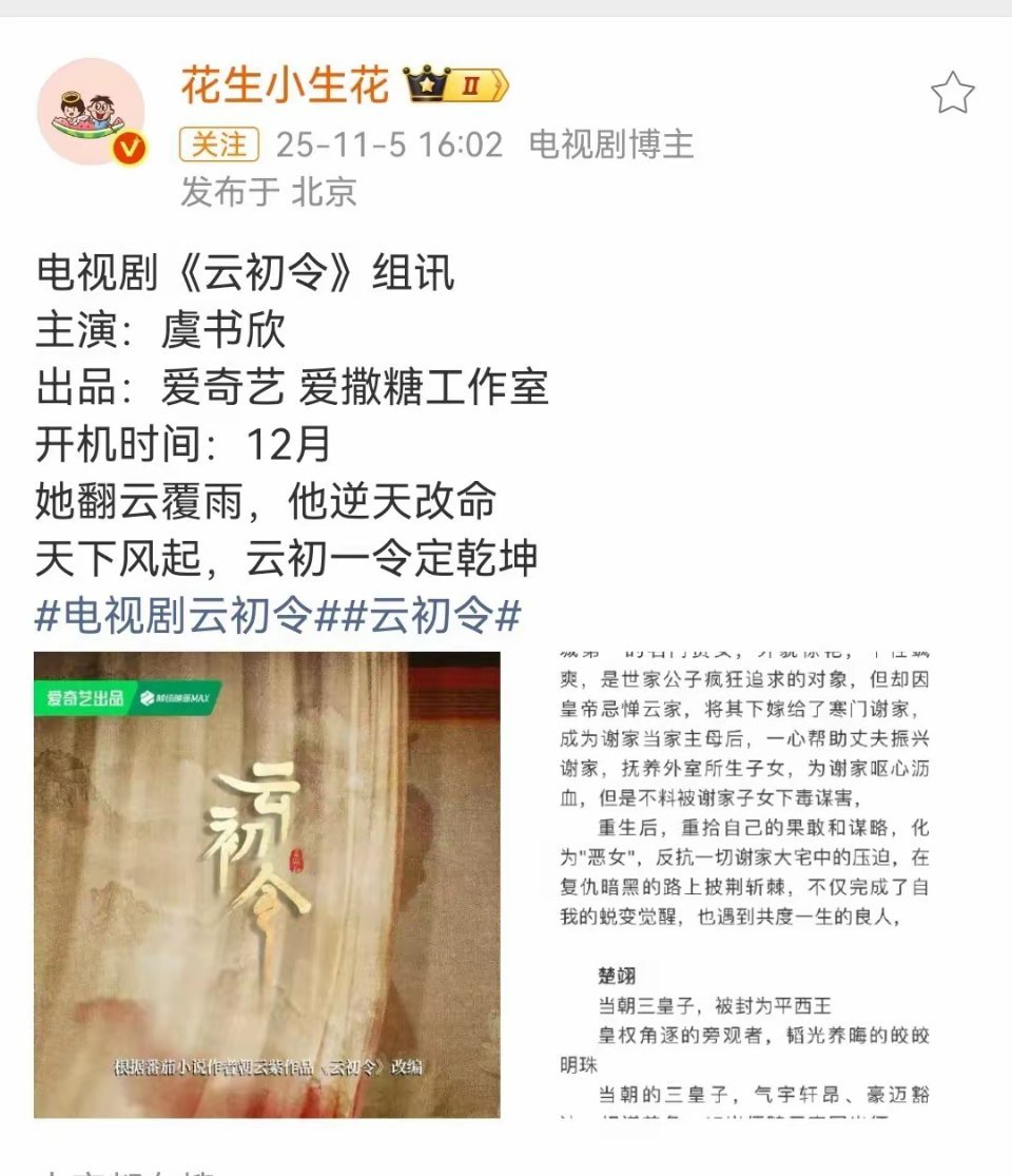 《一笑随歌》扑了对李沁影响蛮大的,新剧《云初令》已出组训,女主由李沁换成虞书欣,男主是张云龙,暂定12月开机。