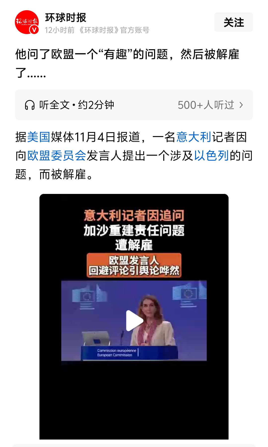 这得有多奇葩?仅仅是向欧盟提了一个问题,意大利记者加布里埃尔・努齐亚蒂就丢掉了工作,这是怎么回事?原来,10月13日,受雇于意大利Nova通讯社的记者加布里埃尔・努齐亚蒂向欧盟首席发言人葆拉·皮尼奥提问有关加沙重建的问题时说:“你已经多次重申,俄罗斯应该为乌克兰的重建买单,你认为以色列应该为加沙的重建买单吗?因为他们几乎摧毁了加沙所有的民用基础设施。”皮尼奥这样回答,这 “绝对是一个有趣的问题,我不会对此发表任何评论。”本来呢,事情到这里就可以结束了,可是这段问答视频竟然在外网疯传,引发了轩然大波。于是两个星期以后,努齐亚蒂收到了解雇邮件,理由是他提出了“一个技术上不正确”的问题。简单说几句。首先,这样的事情,在美西方其实已经见怪不怪了,特别是美国,已经到了“谈犹色变”的地步,既与美国带了头,欧洲怎能不亦步亦趋?据统计,自2023年新一轮巴以冲突爆发以来,已有多名西方记者发表批评以色列的言论而失去工作。其次,那些鼓吹西方自由的人应该好好“学习”这个活生生的案例,那就是他们鼓吹连空气都是自由的西方国家,为什么会发生这种“防民之口甚于防川”的怪事?努齐亚蒂并没有批评以色列,他不过是就欧盟持有的双重标准提出自己的疑问罢了,这有错吗?第三,其实努齐亚蒂的问题并没有错,只不过是因为他的问题,导致视频疯传并将欧盟的“双标”大白于天下,从而让欧盟手足无措失了面子,当然要惩罚他这个“始作俑者”。一句话,他们想怎么做就怎么做,但你不能让他们难做!