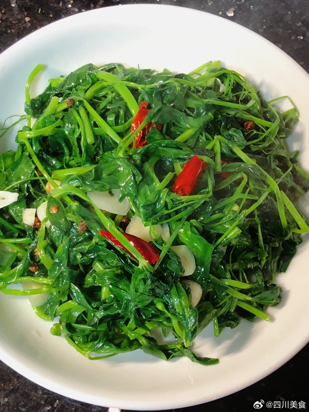 小tips:如果有掐起来老的部分先去掉。豌豆尖很容易熟,是用开水烫一下就能吃的程度,所以不管怎么做,一定要最后下锅,不然吃起来就不脆嫩了。四川美食