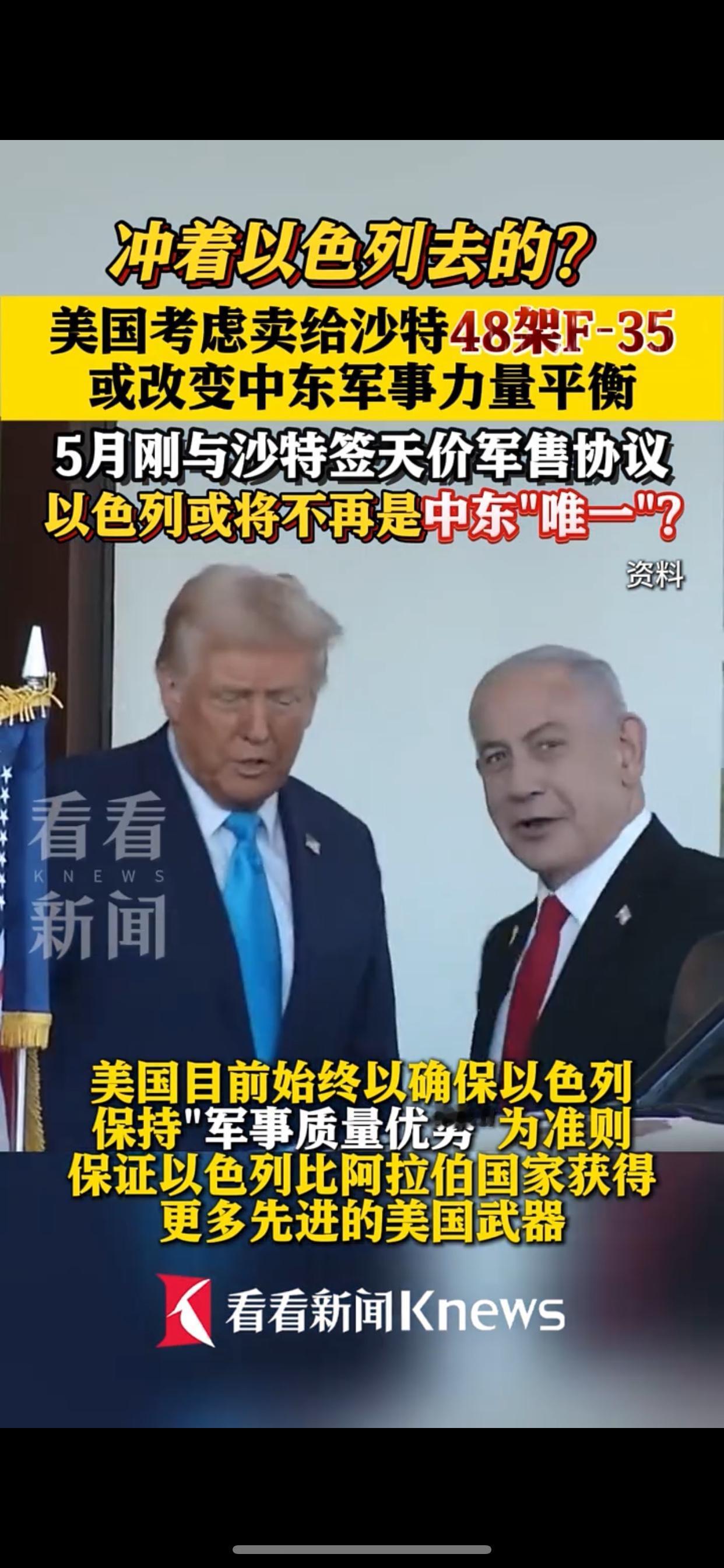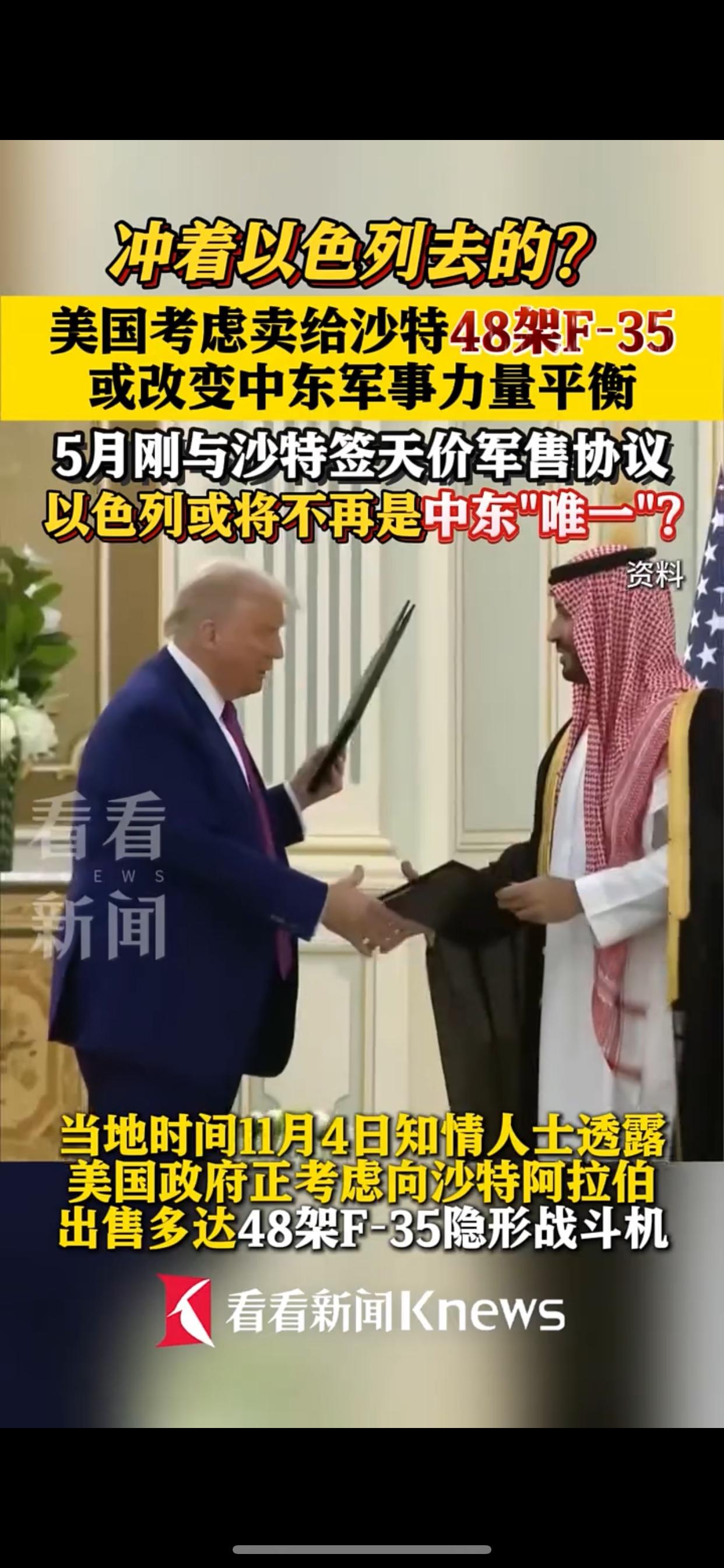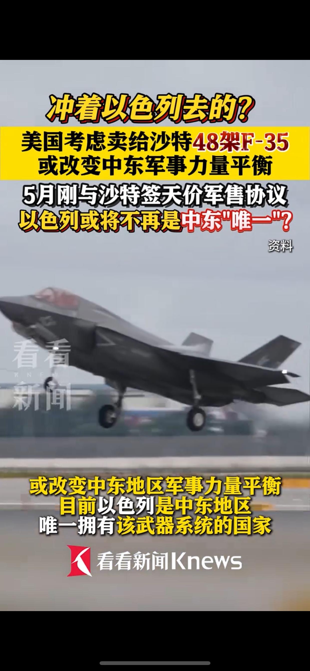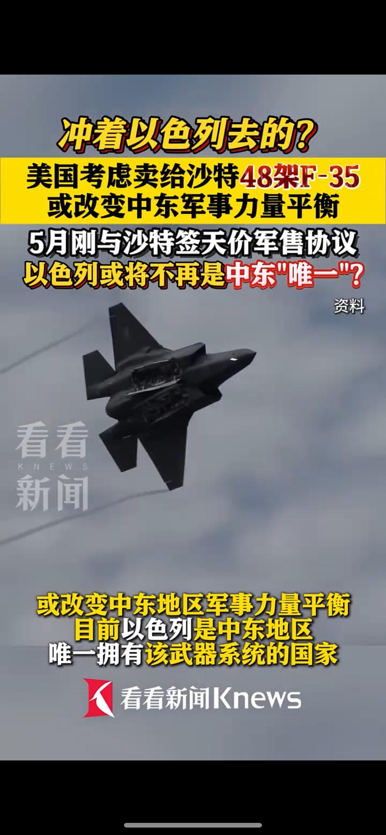 美拟售沙特F-35:中东军力平衡生变? 据知情人士透露,美国正考虑向沙特出售48架F-35隐形战机,交易已推进至国防部部长层级审议阶段。这标志着美国中东政策的重大转变,或将打破地区军力格局。 F-35作为最先进外销战机,具备隐形与多用途作战能力,能显著升级沙特防空体系。此前美国始终以“确保以色列军事质量优势”为由,让以成为中东唯一拥有F-35的国家。 今年5月美沙刚签1420亿美元军售协议,如今F-35交易推进恰逢沙特王储访美前夕。虽沙特战力将提升,但美国通过技术限制、以色列的改装优势仍维持微妙平衡,最终需经多重审批。