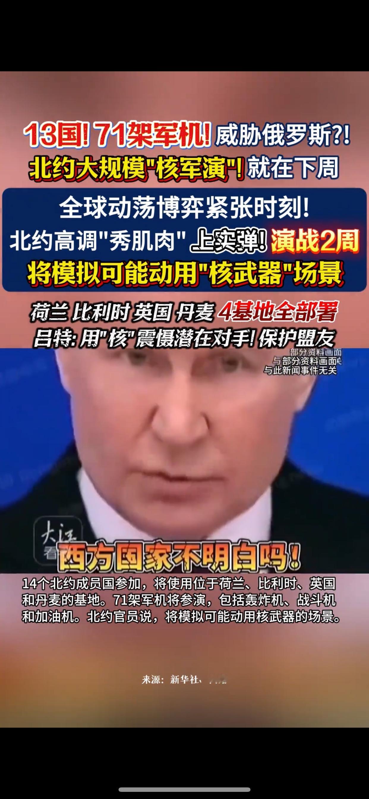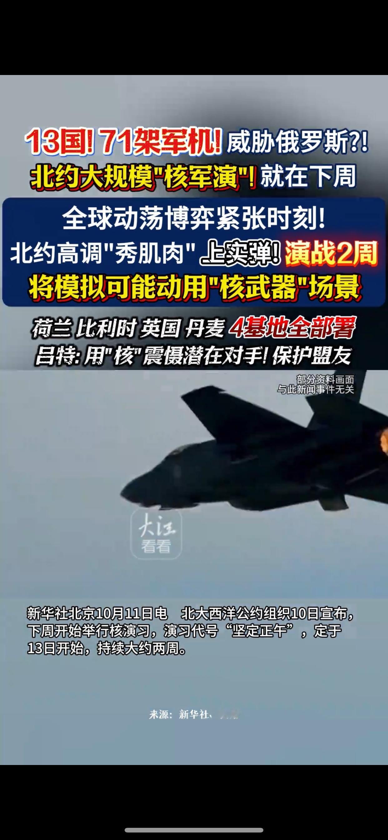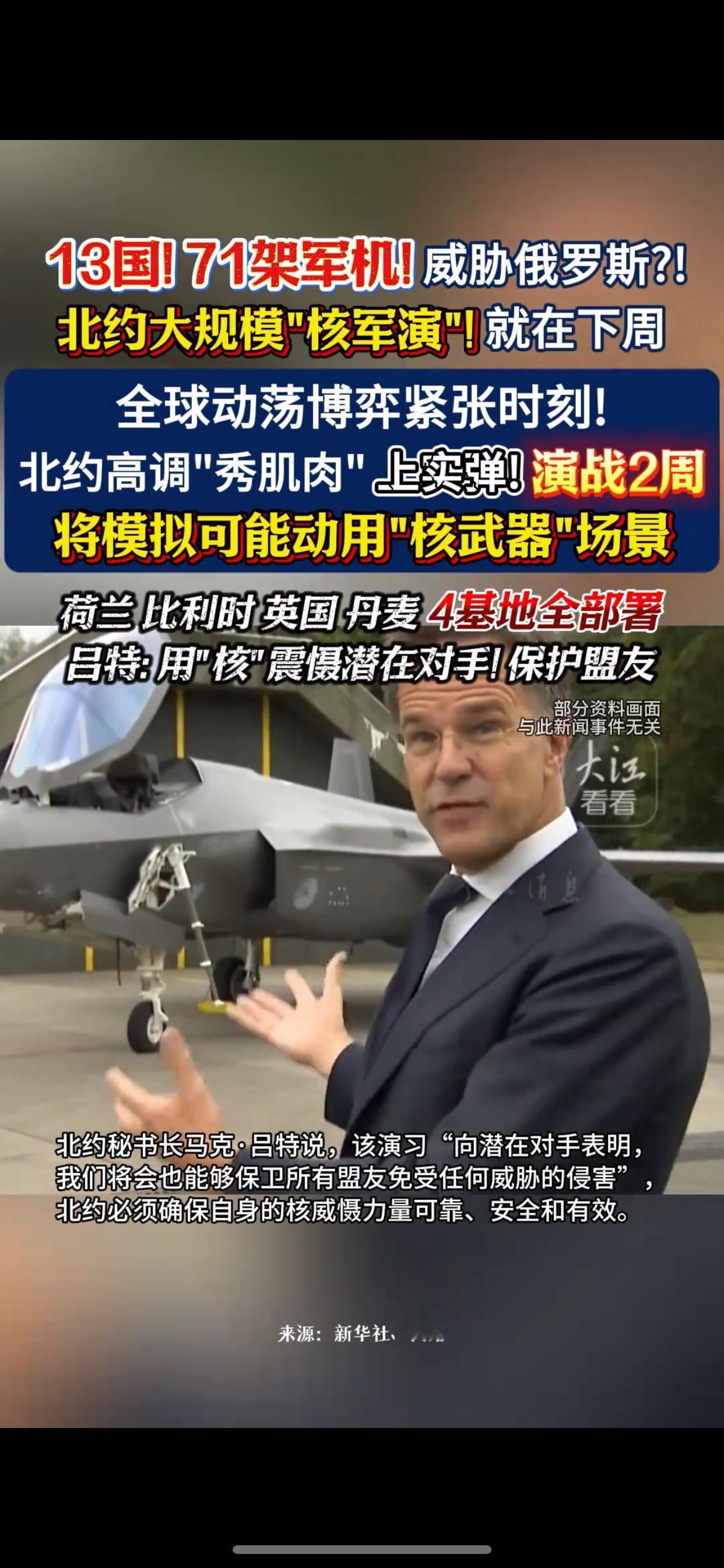 核阴云笼罩动荡时刻:北约军演引全球警惕 在俄乌冲突持续、全球地缘博弈加剧的敏感节点,北约高调宣布将于10月13日启动大规模核军演,给本就紧张的国际局势再添火药味。这场代号“坚定正午”的演习持续两周,集结14国力量与71架军机,在荷兰、比利时、英国、丹麦四地基地同步部署,直指核威慑核心目标。 尽管北约声称演习“不针对任何国家”,但其内容明确包含模拟动用核武器的场景,实战指向性不言而喻。北约秘书长吕特直言,此举是向潜在对手释放“能保卫所有盟友”的强硬信号,以核力量实现震慑目的。 这一动作已引发俄罗斯强烈反弹,俄议员警告称,在欧洲安全格局脆弱之际搞核演习,可能触发冲突升级甚至失控风险,俄方将被迫采取反制措施。 当模拟核打击的战机即将升空,北约的“秀肌肉”非但不能带来安全,反而让全球陷入核误判的危险边缘。在动荡的当下,军事威慑只会加剧分裂,唯有对话才能为世界守住和平底线。