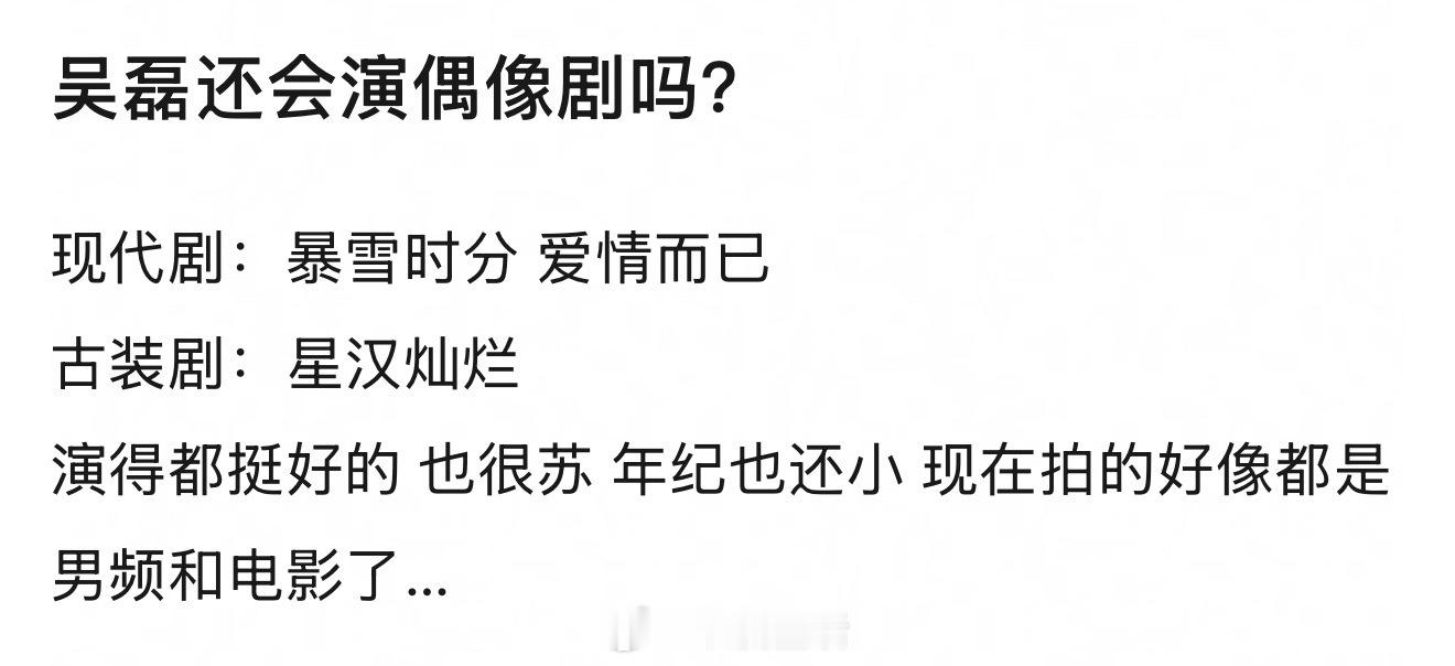 其实我觉得找吴磊的偶像剧本子一定不少,只是现阶段他不想接。还是想演一些不一样题材,类型的作品开拓新的可能性。