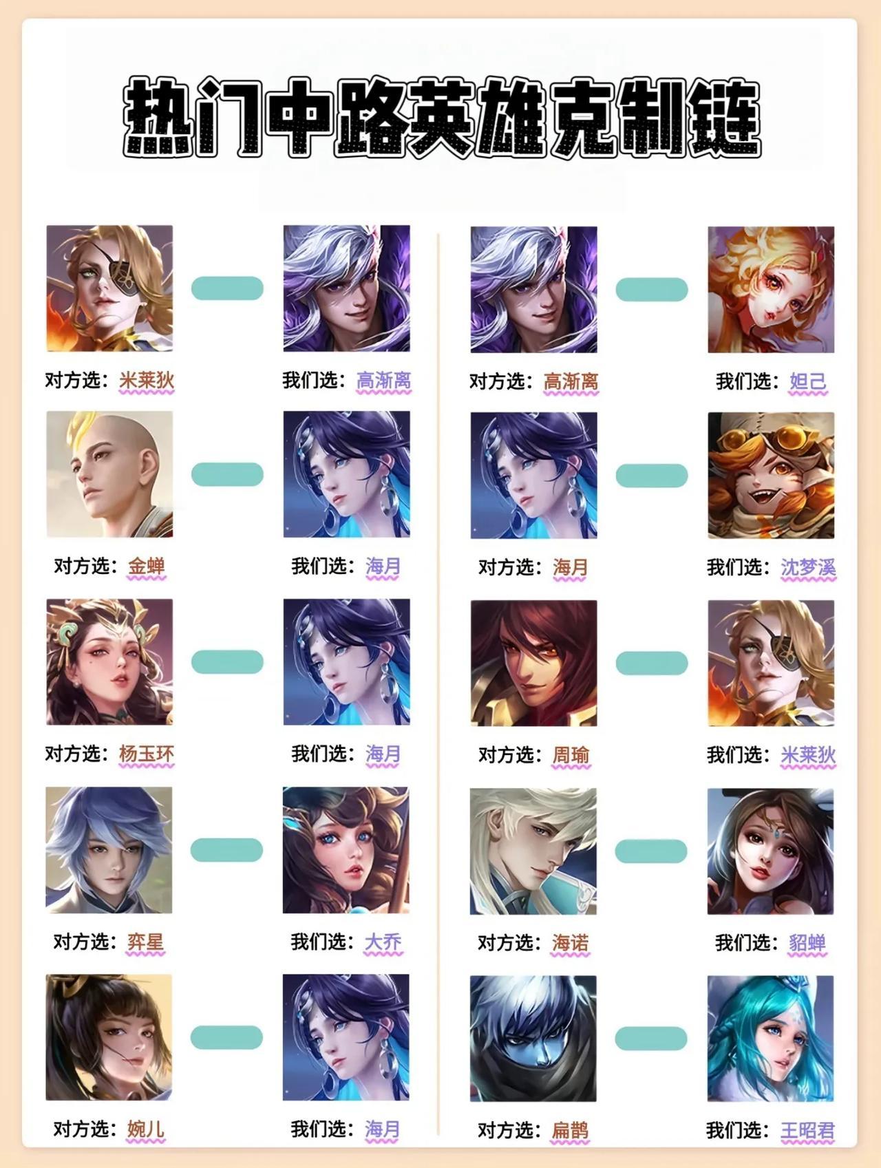 热门中路英雄克制链一览,这下知道对面拿海月该选谁了。 以米莱狄为例,她技能召唤的机器人能强化她的对线能力,让很多中路英雄清线更加吃力,这时候就应该选清线快、伤害高且有位移的英雄应对,比如高渐离。 中路让很多玩家头疼的英雄当属版本强势的海月,操作难度不高的同时强度还很高,一技能清线速度快,二技能有控制的同时还有护盾,最厉害的是大招的减伤和拉人,抓单能力非常强。 看到对面选海月,拿出沈梦溪就能轻松应对,二技能的加速和位移能脱离海月的大招范围,攻击距离还比海月选,海月再厉害也是一拳打到棉花上,拿沈梦溪没办法。