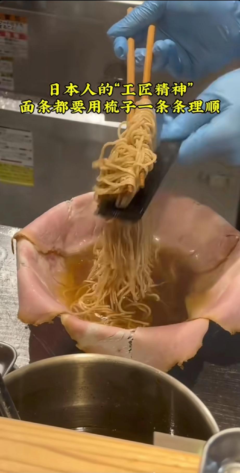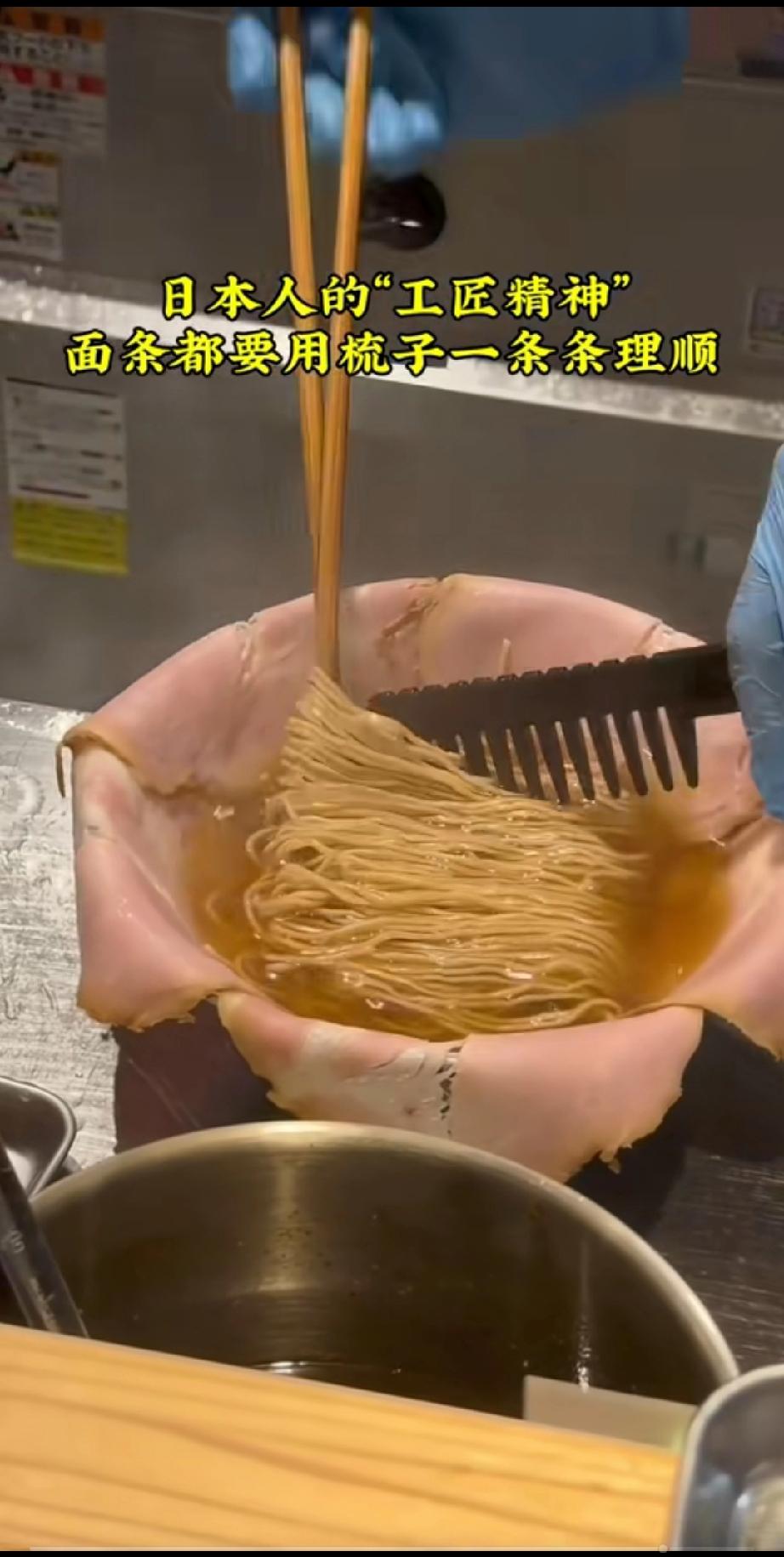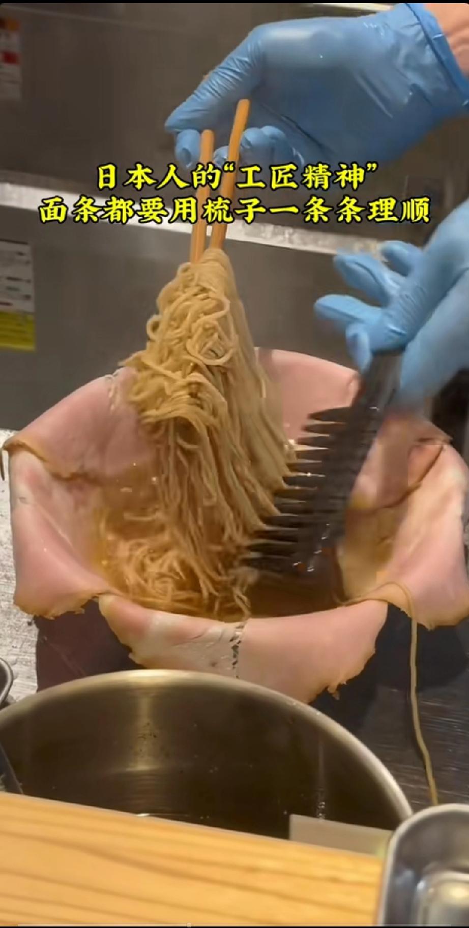 中国人第一回到日本吃面条,被日本服务员的一个操作惊的目瞪口呆! 面条被日本服务员端上了餐桌,中国游客刚想动筷子,没想到日本服务员突然抢过桌上的筷子,然后又顺手不知道从哪里掏出来一把梳子,只见她一手夹起一把面条,一手拿着梳子开始给面条“梳头”,经过服务员一番精心的“打扮”,面条瞬间就变像小姑娘前面的留海似的! 望着眼前根根分明的面条,中国游客拿着手中的筷子陷入深深的思考,莫非日本人发现了什么美食的秘诀,难道面条经过打扮以后味道会变的更美味吗?