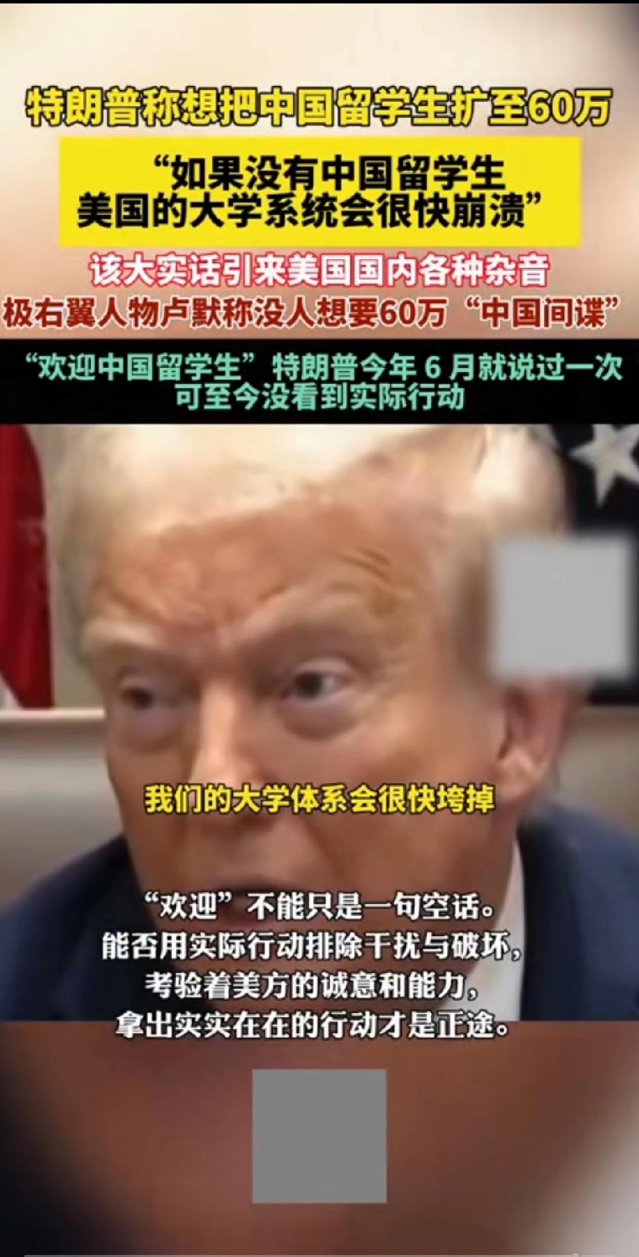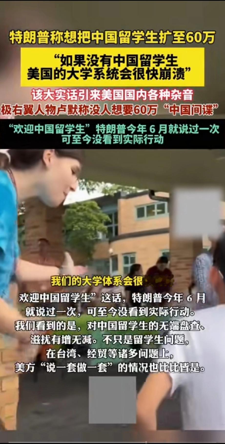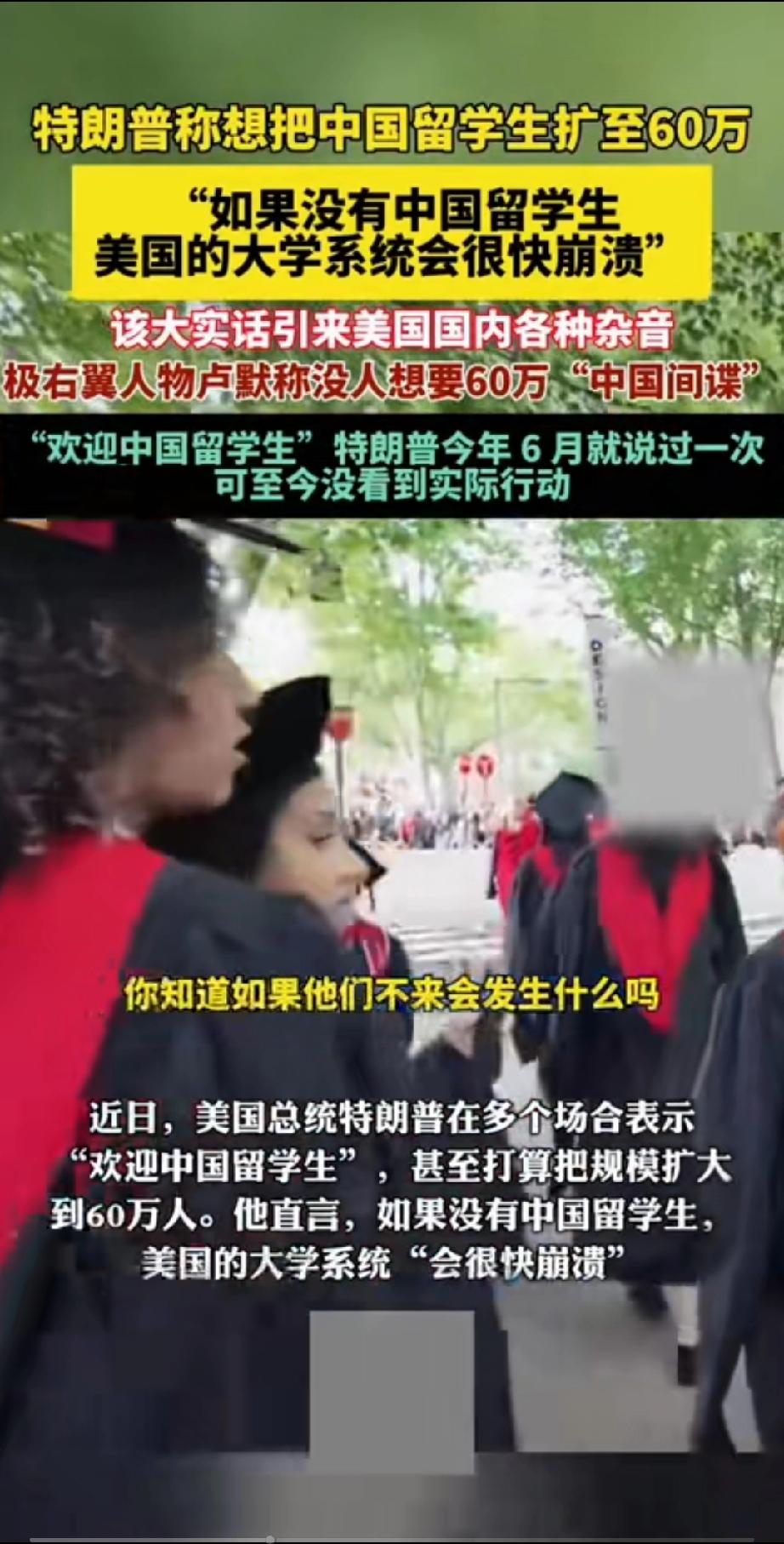 美国人突然发现,如果没有中国留学生,美国大学可能就要办不下去了! 美国国家旅游办公室十月份发布的数据显示,2025年中国留学生持证赴美的人数比2024年降低了19%,原因就是一方面美国政府某些人因为害怕所谓的“中国间谍”而加高了审查门槛,另一方面对中国学生来说可能“美国留学”的魅力已经确实大不如前了! 可是美国大学经这么一闹,却发现如果本校中国留学生的数量持续走低,会给学校的运行带来致命打击,因为中国留学生经济实力雄厚,如果没有中国留学生的“经济加持”,学校的各个系统可能面临崩溃! 为此特朗普急了,亲自喊话: “我想要中国留学生来美国!”