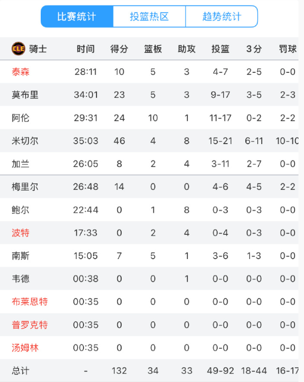 米切尔轰下46分8助,21中15,三分11中6 这是米切尔在骑士的第20次40