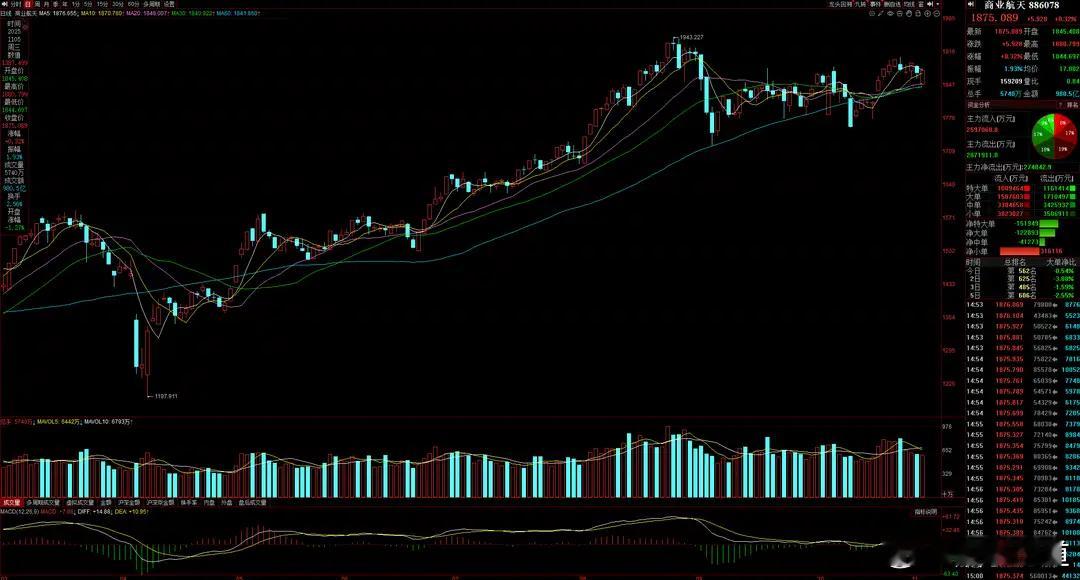 板块技术面:由于主力机构和游资对商业航天的关注度一直不高,所以板块中短期表现较为平淡。目前板块指数还在横盘震荡趋势中,并未做出方向选择。
