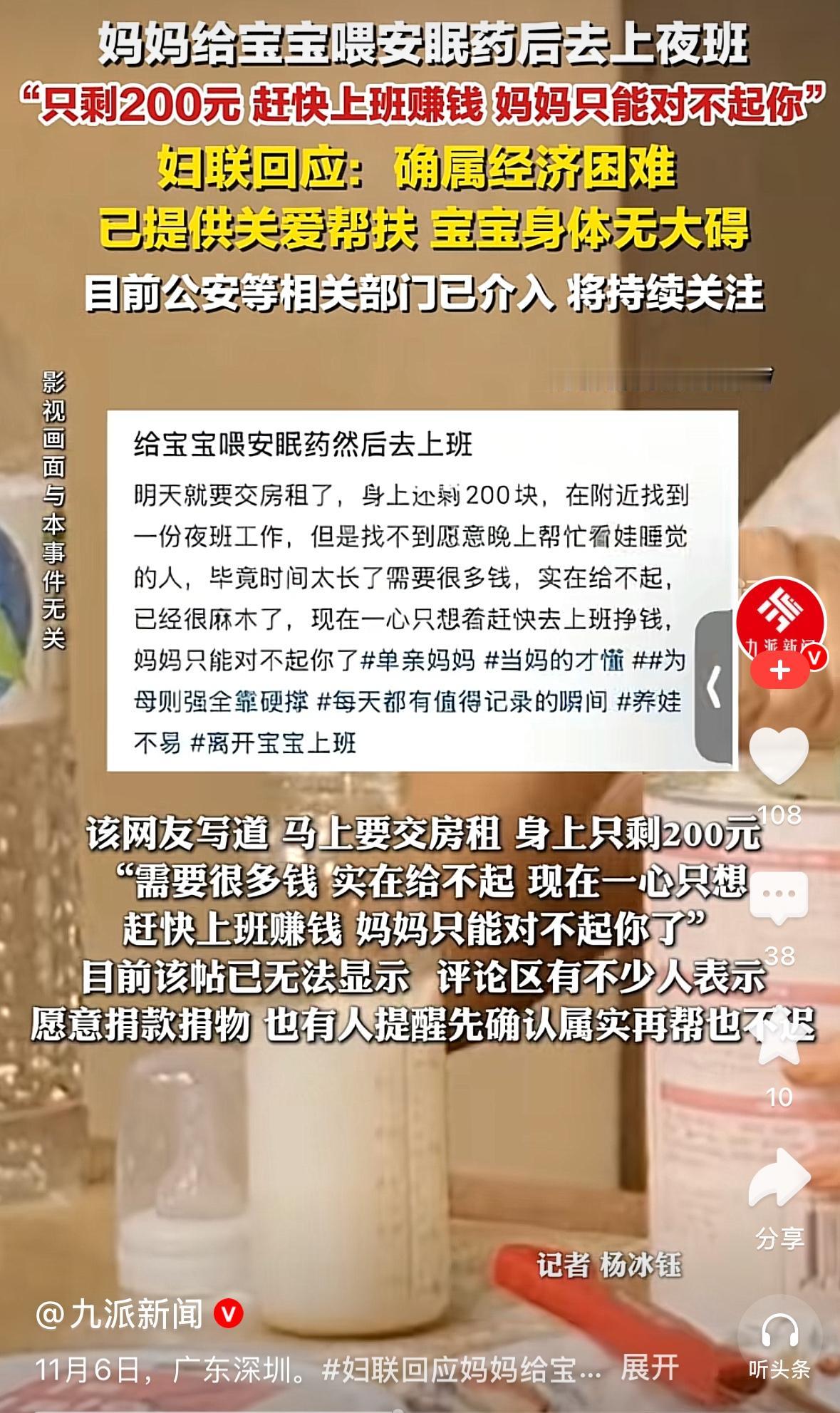 “只能说很心酸。”近日,广东深圳,一女子给自己的宝宝喂下安眠药,就急匆匆地去上夜班:只剩200块钱,需要挣钱。 一则让人揪心又心酸的新闻。一位女子,在给宝宝喂完安眠药后,便匆匆去上夜班。 她身上只剩下200元,交房租的期限越来越近,生活的压力如同一座大山,压得她喘不过气来。 无奈之下,她只能选择用这样的方式,让孩子暂时安静,自己好去挣钱维持生计,嘴里还念叨着“妈妈只能对不起你”。 可以想象,这位妈妈做出这个决定时,内心该是多么的痛苦和挣扎。 她肯定也舍不得让孩子承受哪怕一点点伤害,可现实却逼得她走投无路。 一边是嗷嗷待哺、需要照顾的孩子,一边是迫在眉睫的经济压力,她就像被困在悬崖边的人,每一步都艰难无比。 为人母,从来都不是一件轻松的事。 从孩子呱呱坠地的那一刻起,妈妈们就肩负起了无尽的责任。 要操心孩子的吃喝拉撒,关注他们的成长发育,还要在孩子生病时彻夜难眠地照顾。 而当生活的压力接踵而至,像这位妈妈一样,为了给孩子更好的生活,不得不独自扛起所有的艰难,在困境中苦苦挣扎。 生活或许会给我们出很多难题,但希望社会能多一些温暖和帮助,让这些在困境中挣扎的妈妈们,能少一些无奈,多一些希望。 也希望每一位妈妈都能被生活温柔以待。