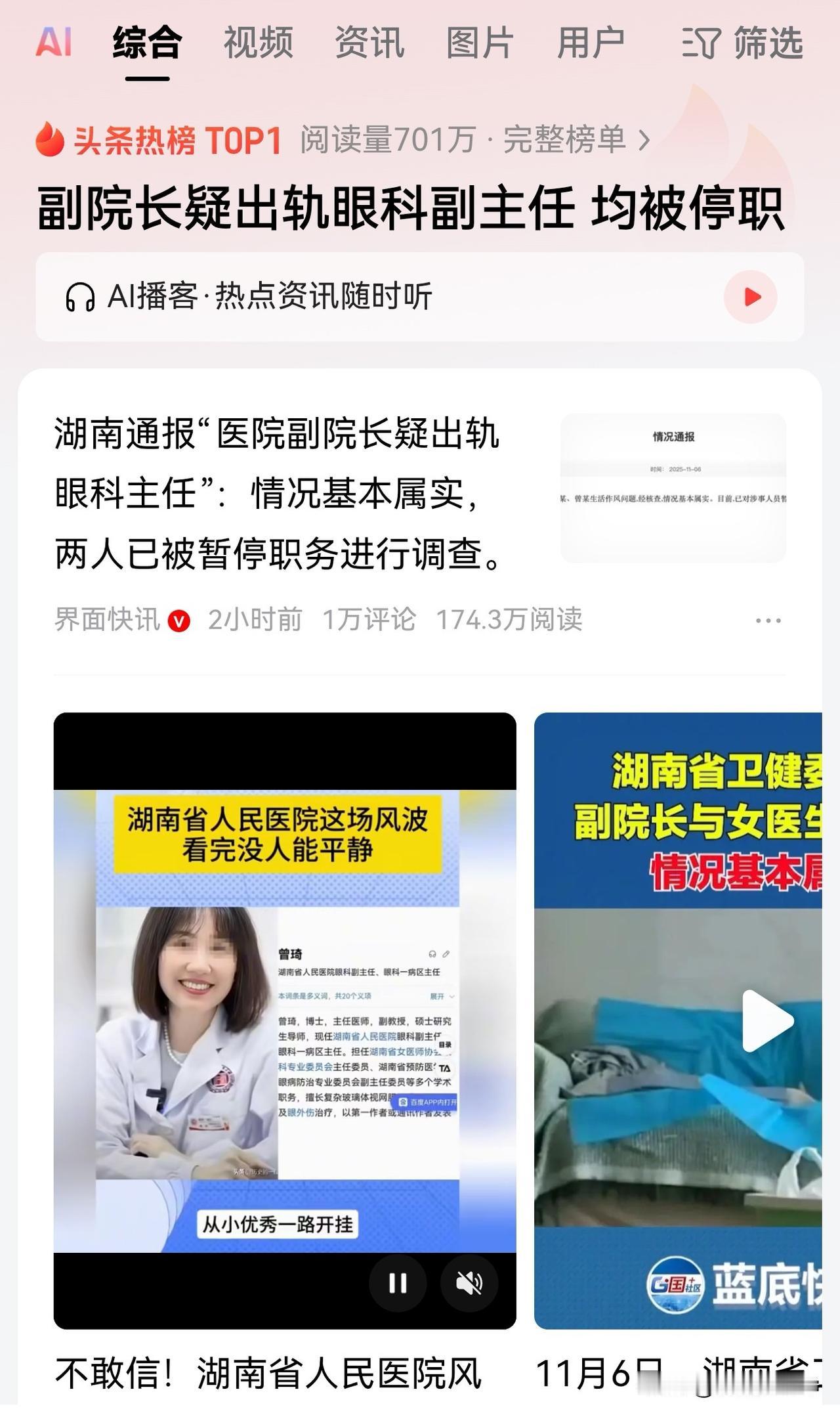 最近有一条消息确实挺火爆的。 就是湖南省人民医院的一名副院长出轨了医院里面的眼科主任。 而且还流出了10多分钟的一段视频。 到底是什么人拍摄了这段视频,并且把它流传到了网上?这个咱们不得而知。 但是往外流传这种视频是不是也违法呀?公安部门难道不应该处理一下吗? 最新的消息,涉事的人员已经被医院暂停了职务不能再就诊了。 目前正在进行调查,如果有问题将依规依纪严肃处理。 像这样的新闻,心净个人建议还是应该低调处理一下。 处理问题的重点应该放在是否有权色交易以及腐败上面。 如果确实没有钱色交易也没有腐败,仅仅是私德有亏。 那么不应该如此大肆的宣传。 人非圣贤,孰能无过? 如果两名医生都是技术大拿,确确实实是骨干力量。 中间也没有任何权色交易,权钱交易。 也就是说没有任何腐败的情况出现。 那咱们还是冷处理吧,批评教育下还是让人家好好工作。 喊打喊杀的,把人家给逼走了,逼到了私立医院甚至逼出国门。 到时候患者又少了有经验的医生。 其实这个问题在咱们中国历史上就已经争论过很多次了。 曹操曾经说过唯才是举。 直接把汉朝那种举孝廉的制度给颠翻了。 在曹操的认知中,你这个人有没有能力是第1位的。 至于说你私德有亏,那是你个人的问题,只要你没违反我的法律,你私下里面有什么毛病并不影响我用你的才华呀! 大家想想曹操当年的唯才是举,现在很多人都可以包容。 可是现实生活中这点事儿却一味的喊打喊杀。 这多少有点双标啊! 千言万语还是一句话,人家搞了这个事情了。 到底有没有权色交易和权钱交易? 相关执法部门应该抓这个东西。 如果有这种违法行为,那就必须严肃处理。 如果真的没有,仅仅就是这点男女的事情。 那咱们就不要浪费公众资源了,你给他这么多的舆论流量又有什么用呢? 好好治病救人不就行了吗? 为什么有的时候好多人才都要往西方世界跑啊! 有一点你确实要承认,外面的世界比较尊重人的欲望。 他们对人的欲望这种东西没有过多的苛责。 也就是说不会把所有的人都给搞成圣人化。 说实话有很多有才能的人跑出去多多少少跟这方面也有一定的关系。
