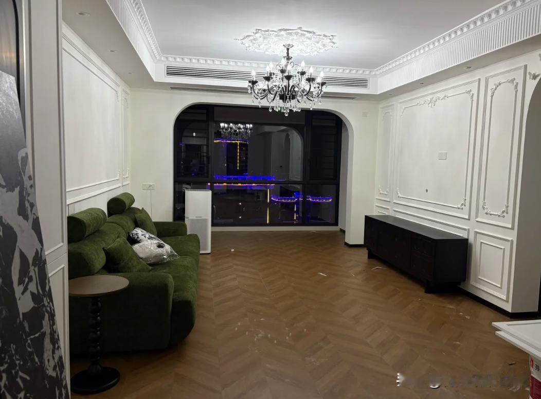 软装踩雷, 有没有人跟我一样,软装进去,心死了一半,我该如何拯救。 感觉这个客灯色温太差,灯功率太小,得把灯换掉,感觉绿色沙发不适合这种水晶灯。 电视墙挂上电视以后感觉这个电视机柜尺寸太小了,和沙发搭起来头重脚轻了,应该买大一点的。 还有就是这个水晶灯的亮度太低了很伤眼睛也让室内看起来很难受。[流泪][流泪]