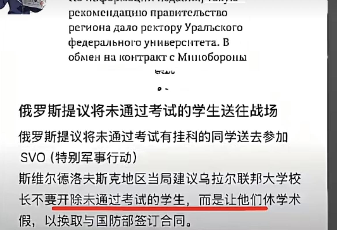不愧是战斗民族、俄罗斯提议将挂科的学生全都送去打仗,斯维尔德洛夫斯克地区当局建议乌拉尔联邦大学校长不要开除没有通过考试的学生,而是让他们休学术假,然后与国防部签合同直接去军事行动,这招实在太狠了,想必学渣们都开始瑟瑟发抖,立马开始埋头努力学习了