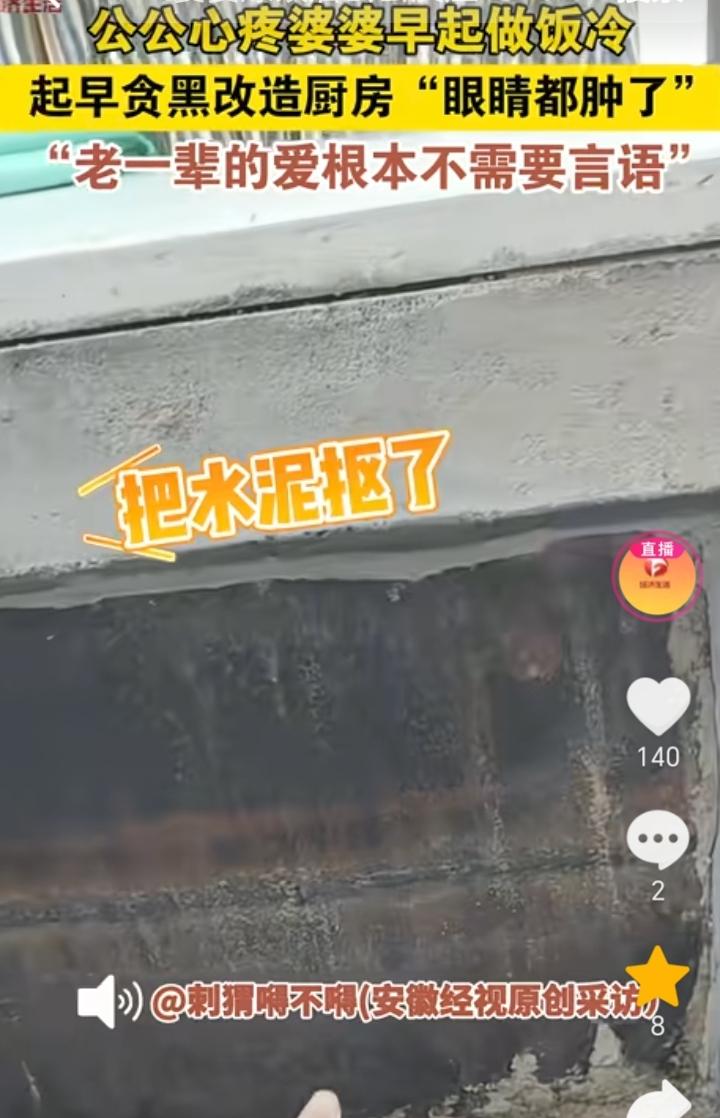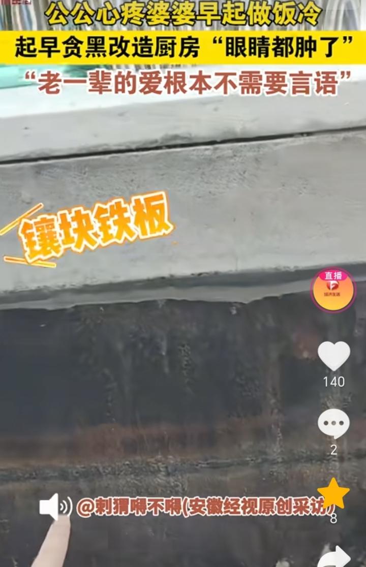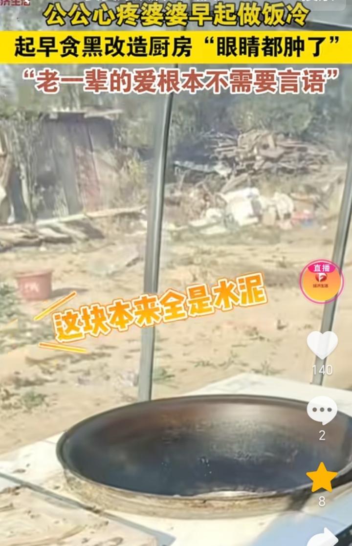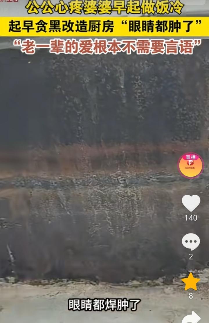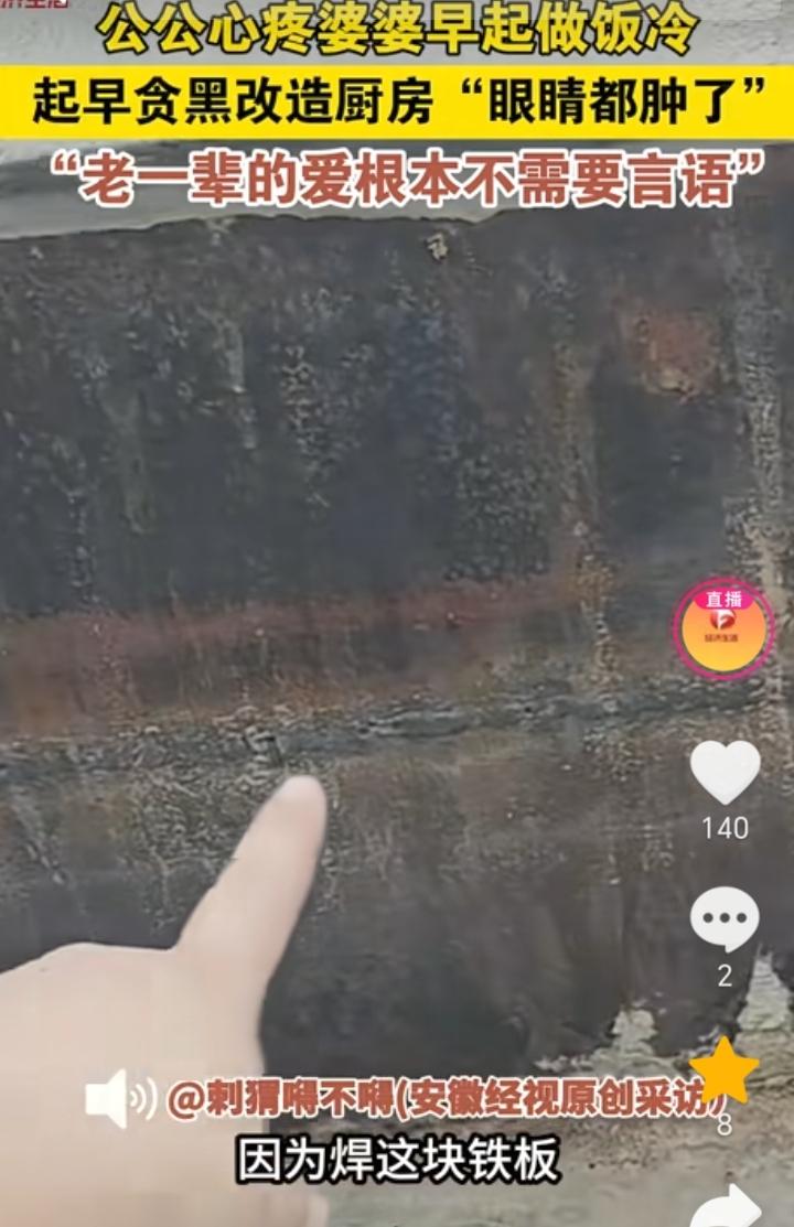 老一辈的爱!吉林,女子的公公心疼婆婆早上起早在大棚做饭太冷,于是就把原本水泥的围墙直接抠了镶上了铁板,铁板导热快这样厨房也能暖和些,由于没有合适的铁板,公公就起早贪黑的用两块铁板焊在一块,眼睛都焊肿了一心只想着能让婆婆早上做饭不那么冷。 就凭这点就能感觉到女子的婆婆嫁对人了,嫁了一个真心对自己好的男人,这点也充分说明了并不是和谁过都是过,可能有人会把妻子当个宝,反之有人可能会把妻子当根草。 老一辈的人虽然没有那么多海誓山盟,也没有那么多的甜言蜜语,但是他们直接用行动证明了对妻子的爱,这种爱情值得人羡慕。 现在的年轻夫妻,全部都嘴上说的好听,实际行动的能有多少呢?