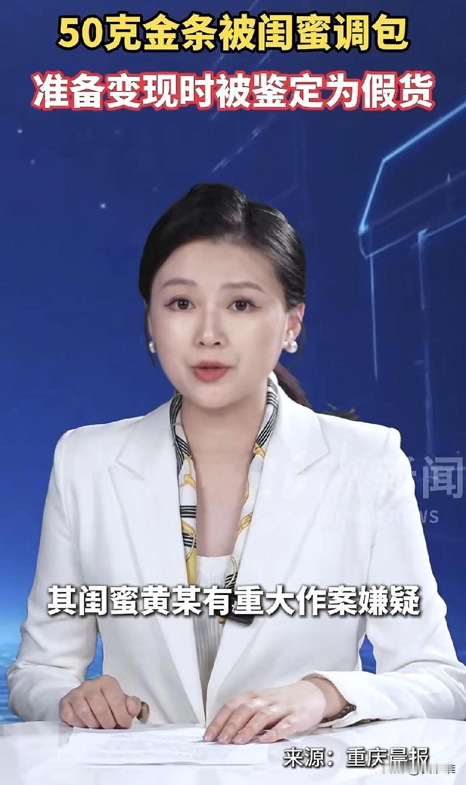 “天大的笑话。”从银行购买的是真金条,准备变现时却变成了假货,女子报警才发现原来是被“好闺蜜”调了包。原来女子前几年在银行低价购买了几根金条,如今金价上涨她打算把这几根金条出售,来到回收点,工作人员检验后告诉她,她的这些金条都是假的。女子懵了,这可是从正规银行买的,怎么会是假的哪,于是拿着凭证来到当初购买金条的银行理论,银行方面表示:这几根金条虽然外观和当初她在银行购买的金条很相似,但是材质却完全不同,女子看交涉无果随即报警。民警调查发现女子购买凭证和银行的销售记录一致,说明当初银行卖的是真金条,而女子拿到手的也是真金条,那怎么现在变成假的了哪?办案民警转变了调查思路,从一处黄金回收店得到消息,最近有一女士出售过和该女子购买的金条编号一致的金条,民警调取监控查看,女子惊呼:“这是我闺蜜啊,经常来我家玩!”民警通过进一步调查最后发现真相,原来女子购买的金条是被她的这位闺蜜给调包了,真相大白,女子气愤的说:“我可是拿她当最好的闺蜜!” 唉,这可真是对防火防盗防闺蜜最好的诠释!