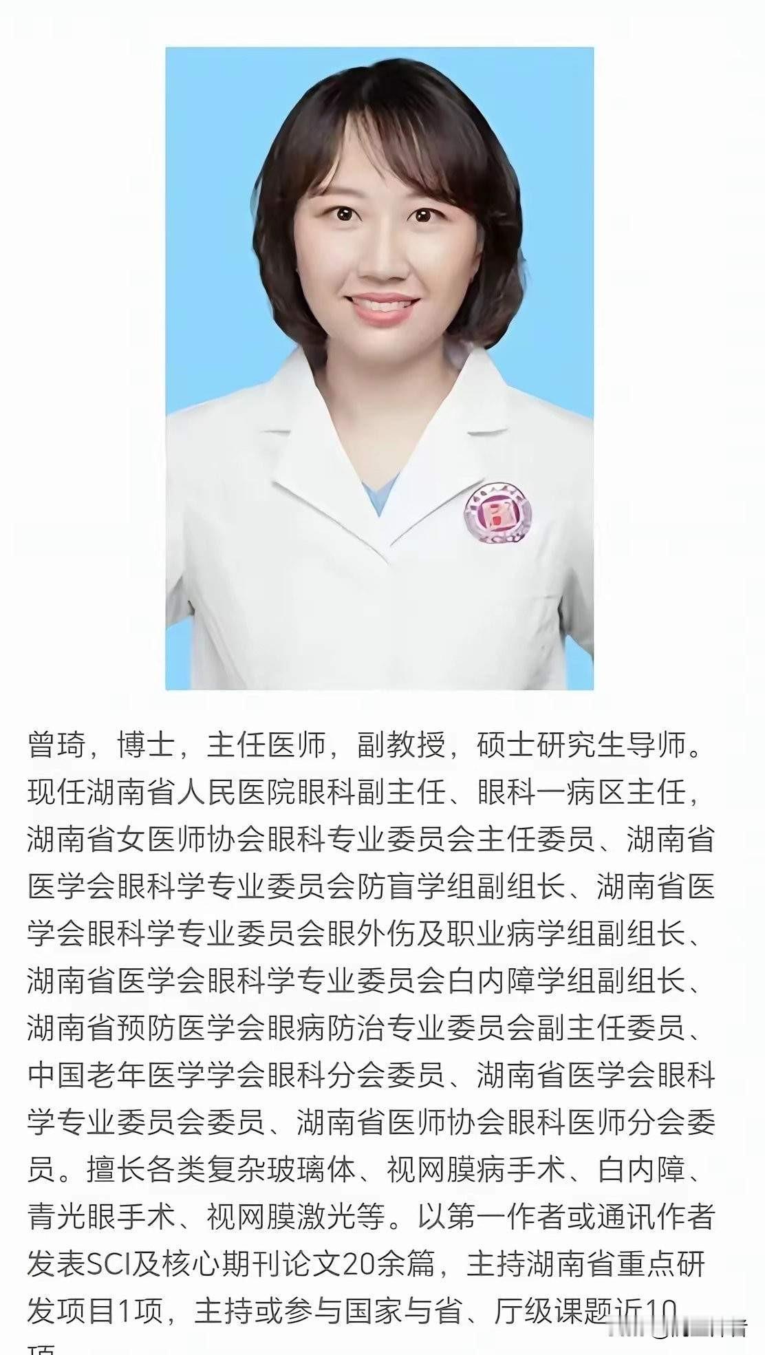 曾琦主任她可以自己开私人眼科诊所吗? 看了她的个人简介,不仅学历高,身份多,专业技术和医术也高,个人科研成果多。如果不出这事,今年才44岁的曾琦主任发展前途可谓一片光明。虽说曾琦主任出轨属于生活作风有问题,于医德无关。