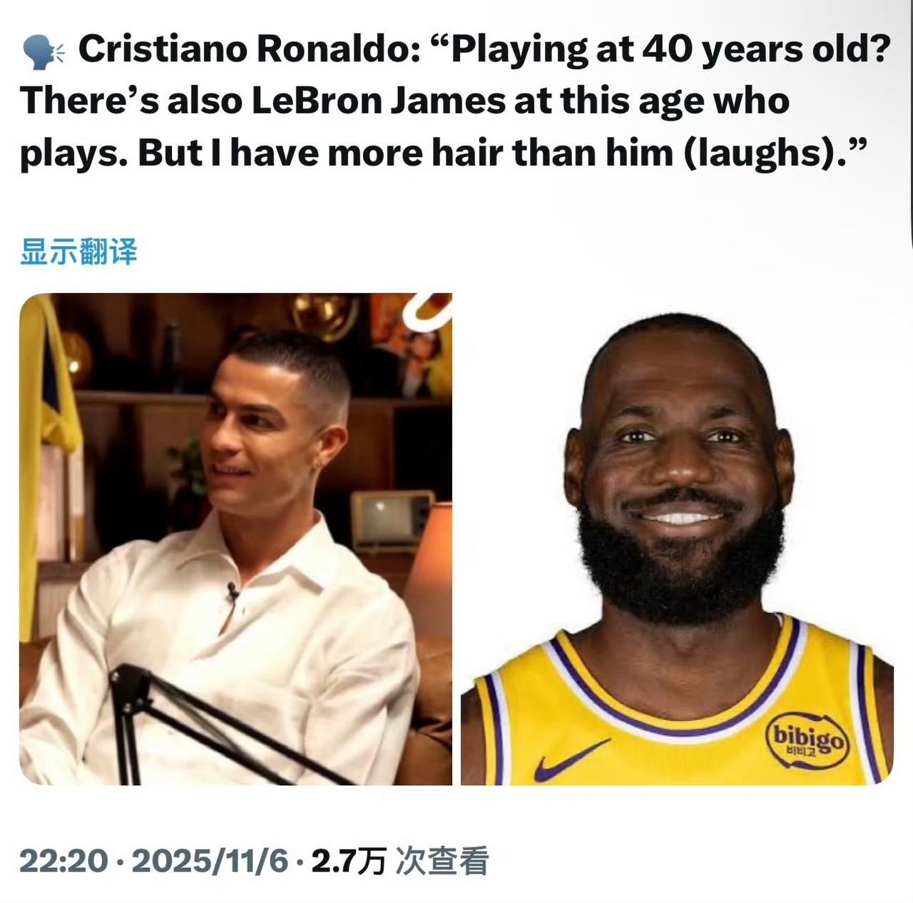 足坛巨星C罗近日接受采访时被问到是否被其他运动员激励到自己时表示: “激励我?我自己算一个。其他运动中也有很多好的榜样,比如篮球运动员勒布朗·詹姆斯,我们年龄相仿,他是个好人,但我头发比他多(哈哈哈哈)!他依然保持着不错的身体机能,现在也还在场上拼搏,并且保持了很好的状态。还有莫德里奇,他看起来也依然很棒。”C罗