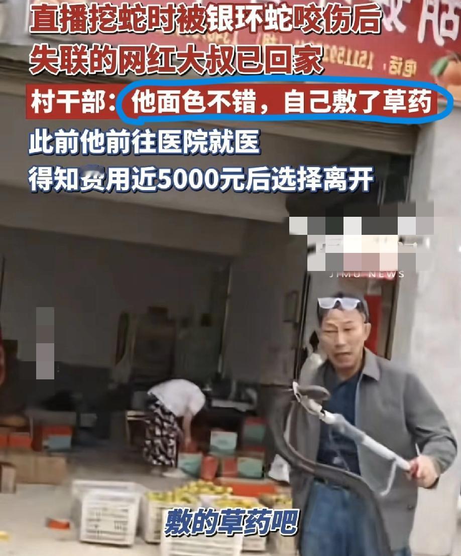 牛!被银环蛇所咬没打血清男子后续来了 近日,那个直播挖蛇的男子被蛇咬,去医院打血清,嫌贵自己放弃,结果反转了。 这个男子叫老尹,算是一个网红,他长期直播自己挖蛇,一周前被银环蛇咬伤,去医院一问,打血清费用大几千,自己离开音信全无,全村人到处寻找,担心不已,很多网友认为凶多吉少。 大家不用担心,老尹已经回家,当时他只是把车牌藏在了后备箱,据村干部介绍说,他自己敷了草药,面色不错,应该没啥大碍,老尹经常抓各种蛇,我还见过他抓眼镜王蛇。这次他有惊无险,并没有注射血清,而用草药解了毒。 这也不奇怪,我老家四川,山里面蛇多,小时候经常有人被蛇咬伤,那时候没有打血清之说,基本都是自己用草药敷好的。我们当地流传一种说法“十步之内,必有解药”。 这个老尹艺高人胆大,他创造了一个医学奇迹,真是牛人一个,佩服佩服。 (信息源来自极目新闻)