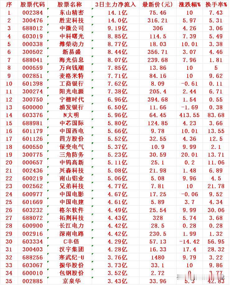 11月7日,前3天主力大幅买入的35名单! 东山精密:3日主力净流入 14.1亿元 胜宏科技:3日主力净流入 14.0亿元 中微公司:3日主力净流入 9.19亿元 中科曙光:3日主力净流入 8.85亿元 潍柴动力:3日主力净流入 8.77亿元 新易盛:3日主力净流入 8.44亿元 海光信息:3日主力净流入 8.07亿元 万向钱潮:3日主力净流入 7.85亿元 麦格米特:3日主力净流入 7.71亿元 工商银行:3日主力净流入 7.62亿元