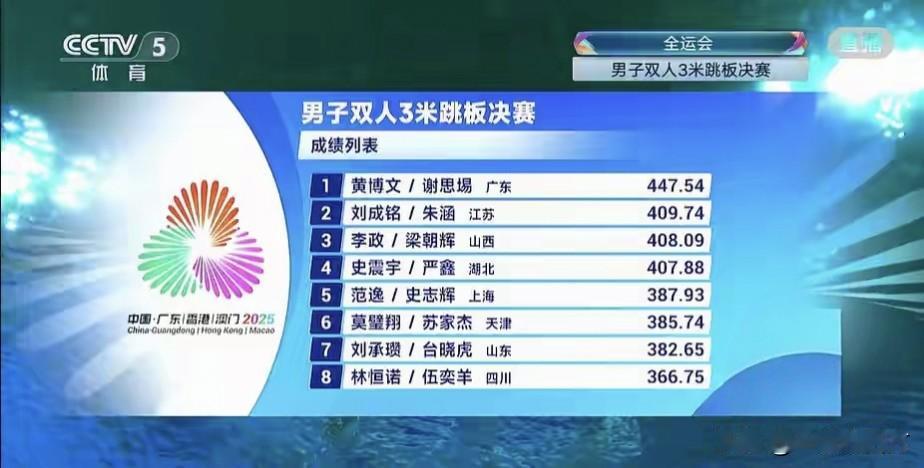 第十五届全运会决出跳水第8金,广东队的谢思埸/黄博文在男子双人3米跳板决赛中以总分447.54夺得金牌,为广东队拿到本届比赛第4金,江苏队的刘成铭/朱涵以409.74分获得银牌,山西队的李政/梁朝辉以408.09分获得铜牌。