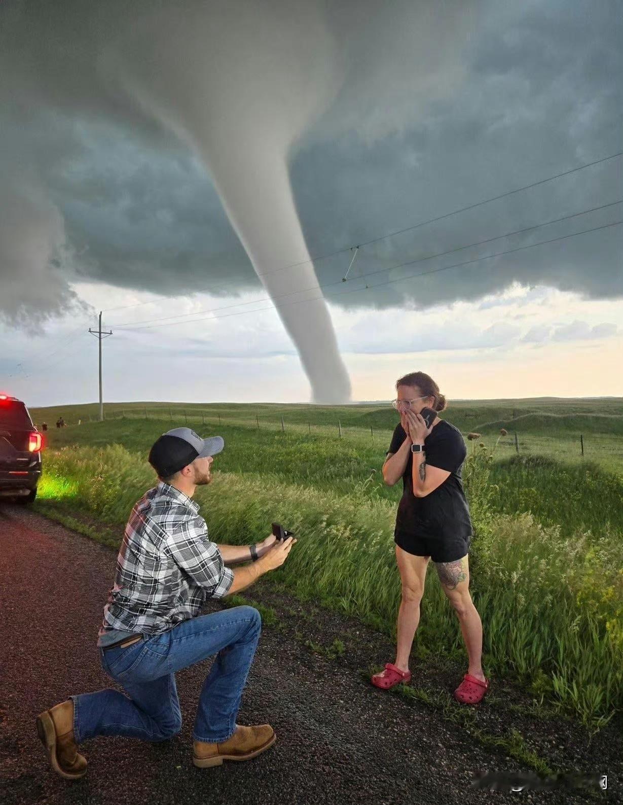 在美国俄克拉荷马州,一对情侣以肆虐的龙卷风为背景求婚。据说两人都是追风爱好者,布