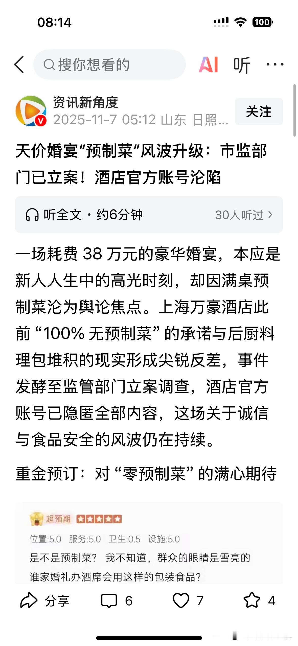 说好不要预制菜,口头承诺也说的好好的!但上海万豪酒店收了客人几十万办婚宴,一转头居然拿出带血的白切鸡、不新鲜的海鲜、一堆难吃至极的预制菜!!! 真是刷新了我们对五星级酒店的认知啊!难怪五星级酒店那么多要倒闭的!这五星级收费却只有廉价外卖的出品,你不倒闭谁倒闭啊!!这样的婚宴实在太糟糕了! 万豪还是关门大吉吧!做大排档都好过啦!请一堆没有厨艺只会开加热包的员工,还要配得上你们五星级的薪酬,着实很难在这样的经济环境中扮演下去了!