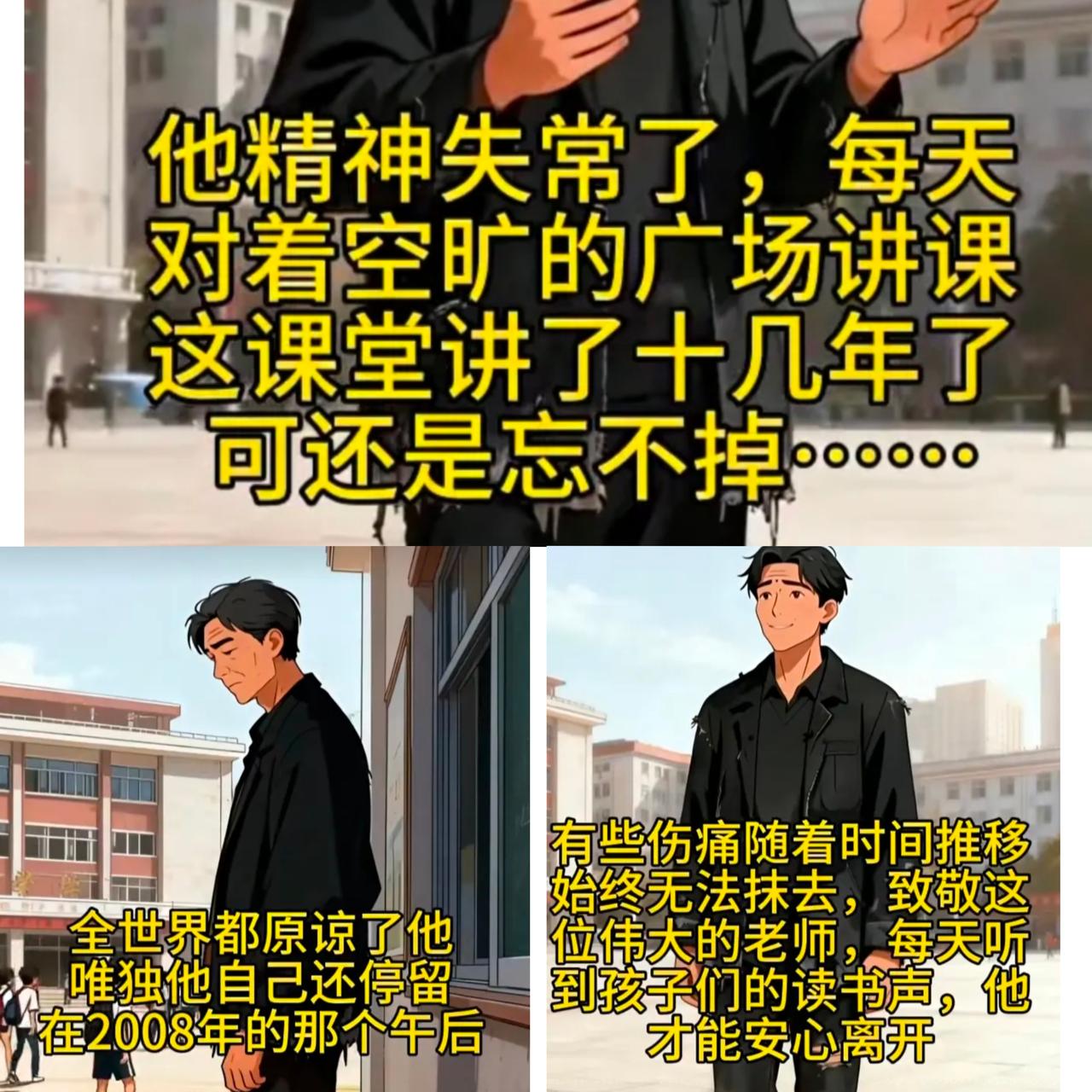 全世界都原谅了他,唯独他自己还困在2008年那个地动山摇的午后。 汶川地震里,这位老师拼尽全力救出了眼前的学生,可回头时,自己班级的教室已化为废墟。从此他成了学校对面的“守望着”,衣衫单薄却日日望着孩子们上下学,偶尔对着空操场念叨“快跑”,把礼貌刻进骨子里,接食物必双手合十道谢。 世人都说他没做错,可善良的人总把他人的遗憾扛在自己肩上。那场灾难的余震,从来都没在他心里停过,他不是精神失常,只是舍不得那些没来得及说再见的学生。 真正的枷锁从不是别人的指责,而是自己过不了的良心关。我们总说时间能治愈一切,可有些愧疚早已刻进骨髓。如果你是他,会用怎样的方式与过去和解?汶川地震 老师