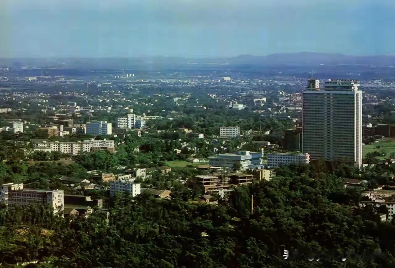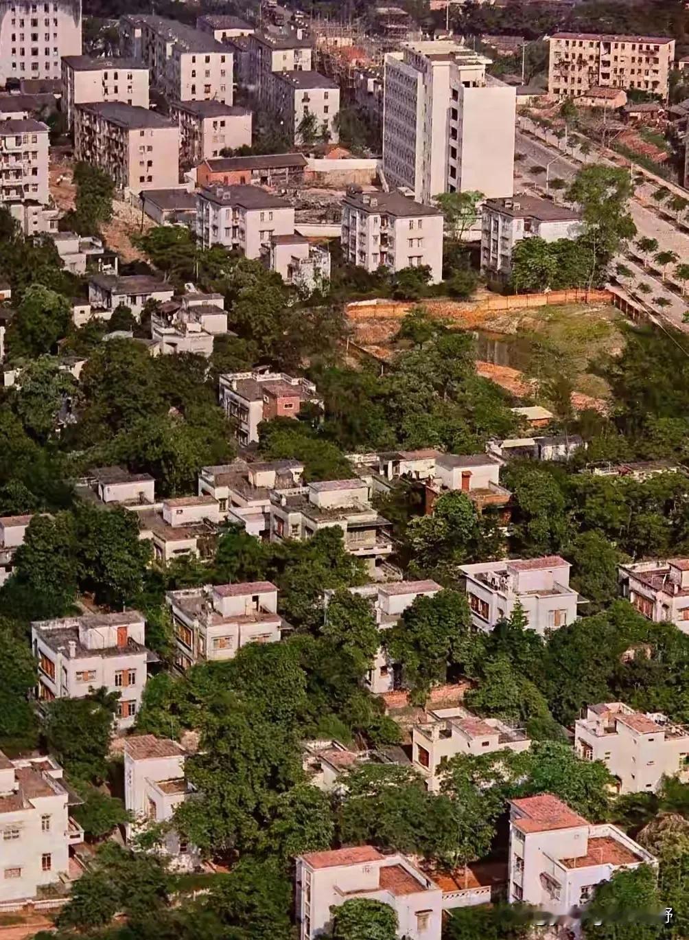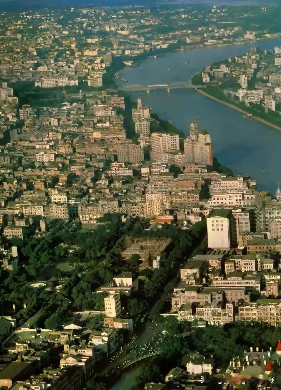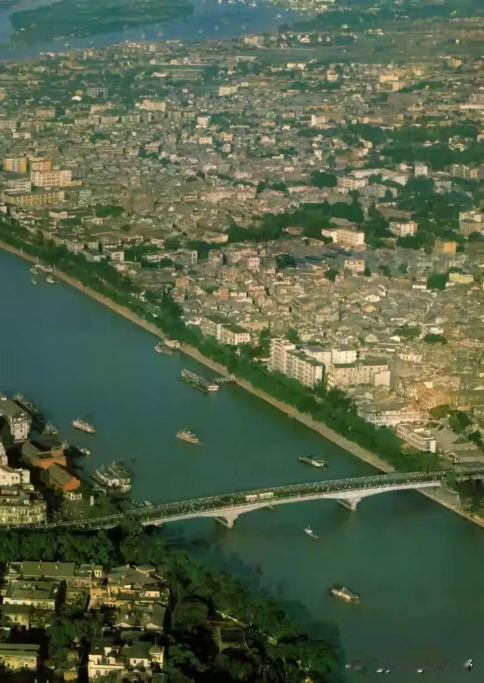 八十年代初期的广州城。那时候的广州老城区绿化也已经很好了,居民楼基本上都被淹没在了绿树丛中。那时候虽然没什么高楼,但大片的建成区已经能够体现出广州这座城市的庞大。那时候广州主城区的珠江还是属于运输水道,江面上运输船只真不少。那时候的江水颜色也看着比较碧绿,水质应该还不错。