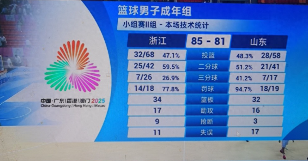 山东全运男篮成年队迎来了第十五届全运会男篮成年组的第二场小组赛。对阵前山东高速男篮主教练丁伟率领的浙江队,山东队以81:85惜败,输掉了这场非常关键的比赛。 第一节比赛,山东队主要依靠内线发起进攻,浙江队则是内外开花,很快以14:7领先。李祥波投进三分,山东队将比分追至10:14。赵仕浩在第一节快结束时眉骨受伤,血染赛场。浙江队随后打出一波12:6,首节以26:16领先。第二节比赛,何思雨连续3次突破到篮下得分,将比分追至24:30。但此后浙江队中锋余嘉豪里突外投,连连得分,分差再度被拉开。上半场结束,山东队以34:43落后9分。下半场比赛,山东队面对内线的大中锋余嘉豪和浙江队的快速反击,依然没有好的应对办法,虽然终场前20.4秒时曾将比分追至81:83,但最终还是没有把握住机会,以4分之差失利。 小组赛前两场战罢,山东队先后输给了广东队和浙江队,小组出线形势非常不乐观,11月8日晚将对阵小组赛最后一个对手江苏队。11月6日晚,江苏队上半场领先广东队7分,但第三节被对手打出18:0,最终以73:96大比分不敌广东队,同样遭遇两连败。 技术统计: 山东队:李祥波22分9篮板3助攻、王岚嵚16分1篮板5助攻、陶汉林13分7篮板3助攻、何思雨13分3篮板、赵仕浩7分1篮板1助攻、陈玖璋7分2助攻、张恩瑞3分1篮板、焦海龙3篮板、刘冠岑1篮板 浙江队:余嘉豪18分9篮板1助攻、刘泽一15分10篮板2助攻、王奕博13分2篮板3助攻、程帅澎11分3助攻、陆文博10分5篮板1助攻、朱俊龙8分6篮板1助攻、张洪硕6分、吴前4分6助攻 双方首发: 山东队:王岚嵚、陈玖璋、何思雨、李祥波、陶汉林 浙江队:王奕博、程帅澎、刘泽一、陆文博、余嘉豪