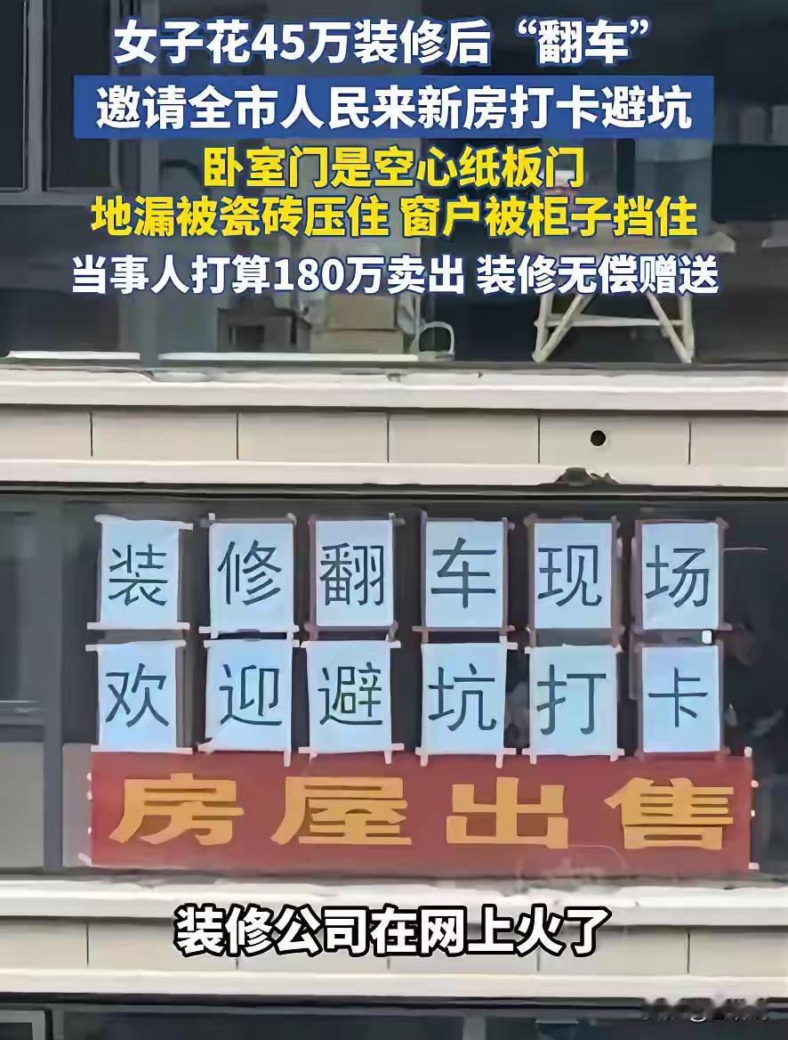 “遇到狠人了!”安徽阜阳,女子买了套160平米的大平层,找装修公司花45万装修,本以为能开开心心入住,结果验房时发现问题百出,一气之下,女子直接邀请网友“打卡避坑”,还把新房挂到网上出售,一下让装修公司火了一把。 刘女士介绍,她的这套房子160平,总价180万,装修花了45万,因为人在外地,整个装修大半年,她一次都没回过现场,全凭微信和设计师沟通,本想着好好住个体面的大平层。可是,事与愿违,装修完后,刘女士到现场验房时,问题一大堆,随便一看就发现了许多质量问题:墙面开裂、瓷砖空鼓、门窗不合格,甚至连最基本的水电接线问题都有。她简直是想抓狂,原本期待的梦中之家,瞬间变成了噩梦。 她不禁感到自己受到了极大的欺骗。在微信上和设计师沟通的时候,一切看似都很顺利,每个细节她都觉得妥当,甚至一度觉得自己的选择很明智。但当自己亲自站到新房中,迎接她的却是满眼的瑕疵。她的耐心在无数的修补过程中消耗殆尽,最终选择了“打卡避坑”——将这套“坑爹”的新房挂到网上出售。 更令人匪夷所思的是,装修公司却依然毫无歉意,他们坚称工程已经按照合同要求完成,而问题大多是由业主的不当使用造成的。听到这种解释,刘女士气愤难平,她表示: “这不是我的责任,我买的是新房,不是二手房,凭什么我承担这些不该有的麻烦?” 那么,问题究竟出在哪儿?首先,刘女士在选择装修公司时,是否做足了调查和选择?她自己也表示,因为自己身在外地,并未亲自监督装修过程,完全依赖微信沟通。这在某种程度上,也让她失去了对装修质量的直接控制。很多消费者往往过于信任装修公司的承诺,忽略了自己实际参与和监督的重要性。 其次,装修公司方面的责任也不容忽视。虽然每个项目都会有不同程度的问题,但问题的严重性和处理态度才是关键。从刘女士的描述来看,这家装修公司似乎对质量管理的重视程度并不高,且在出现问题后,采取了推卸责任的态度。对于消费者来说,质量和售后服务是选择装修公司的重要依据,而该公司的服务显然没有达到预期。 不仅如此,刘女士还表示,整个装修过程虽然长达半年,但每次的沟通和反馈都是在网络上完成的。这种远程沟通和监督的方式,虽然方便,却也带来了信息不对称和对细节控制的盲区。尤其是在家装这样需要大量细节调配的项目中,远程操作往往让设计和实际效果产生偏差,最终导致的结果是“看图做工程”的荒谬局面。 还有一点,不得不提的是消费者在选择装修公司时常犯的一个错误——过度信任“价格高就是好”。45万的装修费用对于一套160平米的大平层,算是一个不低的价位。很多人可能会认为,价格一旦高了,装修质量就会有保障。然而,刘女士的经历却告诉我们,价格高并不等于质量好,装修公司是否能够提供真正的优质服务和实际保障,才是关键。 除了装修质量问题外,刘女士的经历也反映了现代社会中一种普遍现象,那就是消费者对“品牌”或“口碑”的盲目依赖。装修公司常常通过口碑营销、线上宣传来吸引消费者,而这种信息传递途径常常无法准确反映真实的服务水平。很多消费者会倾向于选择看起来评价不错的公司,却忽略了自身实际需求和装修的特殊性。 通过刘女士的“打卡避坑”事件,也可以看出消费者在家装领域的维权意识逐渐觉醒。以往,很多装修纠纷常常以消费者的沉默或妥协收场。但如今,越来越多的消费者开始敢于站出来发声,用自己的亲身经历提醒他人避免重蹈覆辙。这种趋势有助于促进行业内的改进和完善。 各位读者你们怎么看?欢迎在评论区讨论。