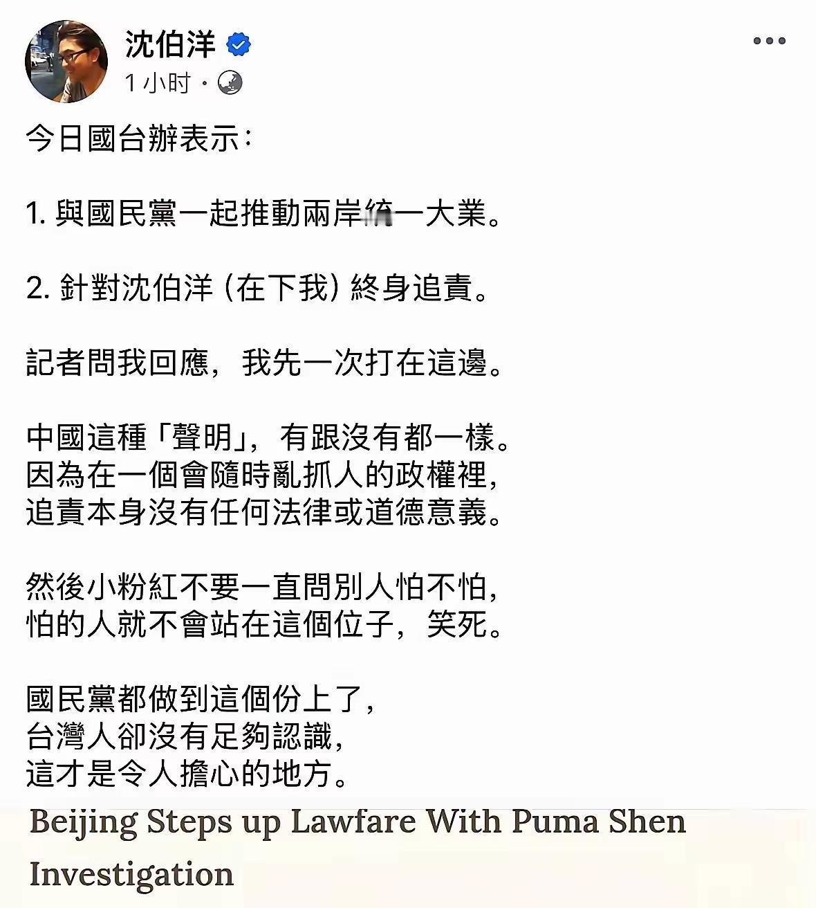 继黑熊学院全体举牌支持沈伯洋后,沈伯洋又发话了,中国所谓对他终身追责的声明没有任何意义,自己根本不怕,怕就不会在这个位子了,还表示自己笑死。 他说真正让台湾人担心的是,国民党和大陆这边一唱一和,这才是台湾危机。 有网友说:大陆敢做说明就有办法,缅甸案件刚开始也没有人信,现在呢?相信 这个货本来大脑出了问题,叫偏执狂暴症,不知道他的下场是什么结局,试目以待! 尽快落实吧公安部门!早点抓起来,看他死到临头还嘴硬!沈伯洋你和14亿人作对,你就是死路一条! 缅北犯罪集团我们都能抓回来判死刑,你个沈伯洋算个毛,等我们真动手的时候,看你还有多嘴硬,就凭这货不断挑衅,司法系统必须下重手严查严办,真正起到严惩一个震摄一片的作用!!! 有没有人把举牌的人名一一报出来?然后另一些人把他们的关联人,公司,业务也一一报出来。过街老鼠,人人喊打。。 大家怎么看呢?