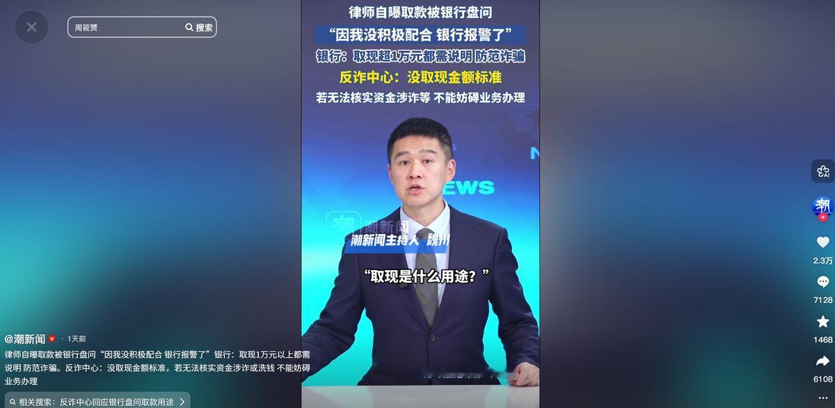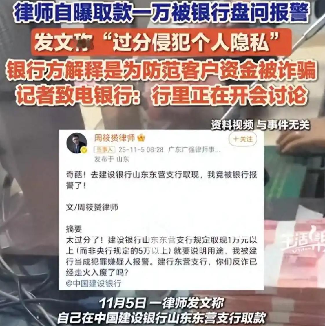 网红律师取钱被拒还遭“报警”,发灵魂拷问:谁给的权利? 山东东营一场普通的银行取现,硬是闹出了全网热议的动静,一位男子去银行取 1万元现金,本是为朋友结婚准备红包,没成想全程被银行工作人员轮番盘问,甚至被威胁要报反诈中心,而这位男子并非普通人,他是知名网红律师周筱赟。 事后他在网上抛出的灵魂拷问,不仅道出了自己的遭遇,更戳中了无数人心里的憋屈:“取 1 万块而已,我的隐私凭什么被随意打探?银行的操作真的合规吗?” 周筱赟在网上详细还原了当天的经过,字里行间满是不解与质疑,他说,刚提出要取 1 万元现金,银行工作人员便接连抛出一串问题:“取这些钱干什么用?”“你账户里最近那笔转账是从哪来的?” 语气里带着明显的审视,仿佛他取的不是 1 万元,而是一笔来路不明的巨款,更让他无法接受的是,这些盘问并非简单的提醒,而是带着 “审查” 的意味,甚至隐隐暗示他的资金可能有问题。 作为法律从业者,周筱赟当即意识到不对劲,他明确表示自己的资金来源合法,取现用途正当,并且拒绝配合这种超出规定的盘问。 没曾想他的拒绝竟引来银行更强硬的回应:“你不配合,我们就联系反诈中心出警!” 这话让他哭笑不得,无奈之下只能在银行里干等,可足足等了半个多小时,所谓的警察始终没来,最后银行工作人员又突然改口,说可以正常办理取现业务。 前后矛盾的操作,让这场取现经历充满了荒诞感,周筱赟直言自己并非小题大做,而是这种情况早已不是个例,很多普通人去银行办理低额取现业务时,都曾遭遇过类似的过度盘问,只是大多数人要么被问得不知所措,要么怕麻烦选择忍气吞声没人愿意较真。 而他之所以站出来,就是想问问,银行防诈是责任,但凭什么以 “反诈” 为名,侵犯客户的隐私和合法权益? 平心而论银行的处境并非不能理解,近几年电信网络诈骗高发,各类诈骗手段层出不穷,银行作为资金流动的第一道关口,承担着沉重的反诈压力。 一旦客户资金被骗,不仅客户会蒙受损失,银行也可能面临监管问责,所以不少银行都奉行 “宁可多问一句,不可放过一个” 的原则,试图通过层层盘问把风险降到最低,初衷确实是好的,可再好的初衷,也不能成为随意扩大权限、侵犯客户权利的理由。 熟悉政策的人都知道,央行早有明确规定,个人办理人民币现金取款业务时,单笔金额在 5 万元(含)以上的,银行才需要对资金用途、来源进行必要核查,5 万元以下的小额取现,银行无需强制询问,更不能以 “反诈” 为由设置额外门槛。 周筱赟取的 1 万元,远低于 5 万元的核查标准,银行这番 “上纲上线” 的盘问,显然超出了政策规定的范围,说是 “多此一举” 都算客气,本质上已经触碰了合规的边界。 更让人不舒服的是,这种过度盘问传递出的 “怀疑感”,普通人去银行办业务,图的是方便快捷,更是对银行的信任,可当取 1 万元都要被追问 “钱从哪来、要到哪去”,甚至被威胁报警时,这种信任瞬间就被打破了。 就像网友评论的:“明明是自己的钱,取出来却像犯了错一样,这种感觉太憋屈了。” 防范诈骗的尺度,在一些一线操作中被无限放大,慢慢变成了形式主义,不问是否必要,只问是否 “问过”,至于客户的感受、是否合规,反而被放在了次要位置。 客户愿意把钱存进银行,存的不仅是资金更是信任,这份信任容不得半点随意的消耗,守住合规的底线,尊重客户的权利,才能真正实现 “防诈” 与 “服务” 的双赢,这才是金融机构该有的样子。 (信息来源:潮新闻)