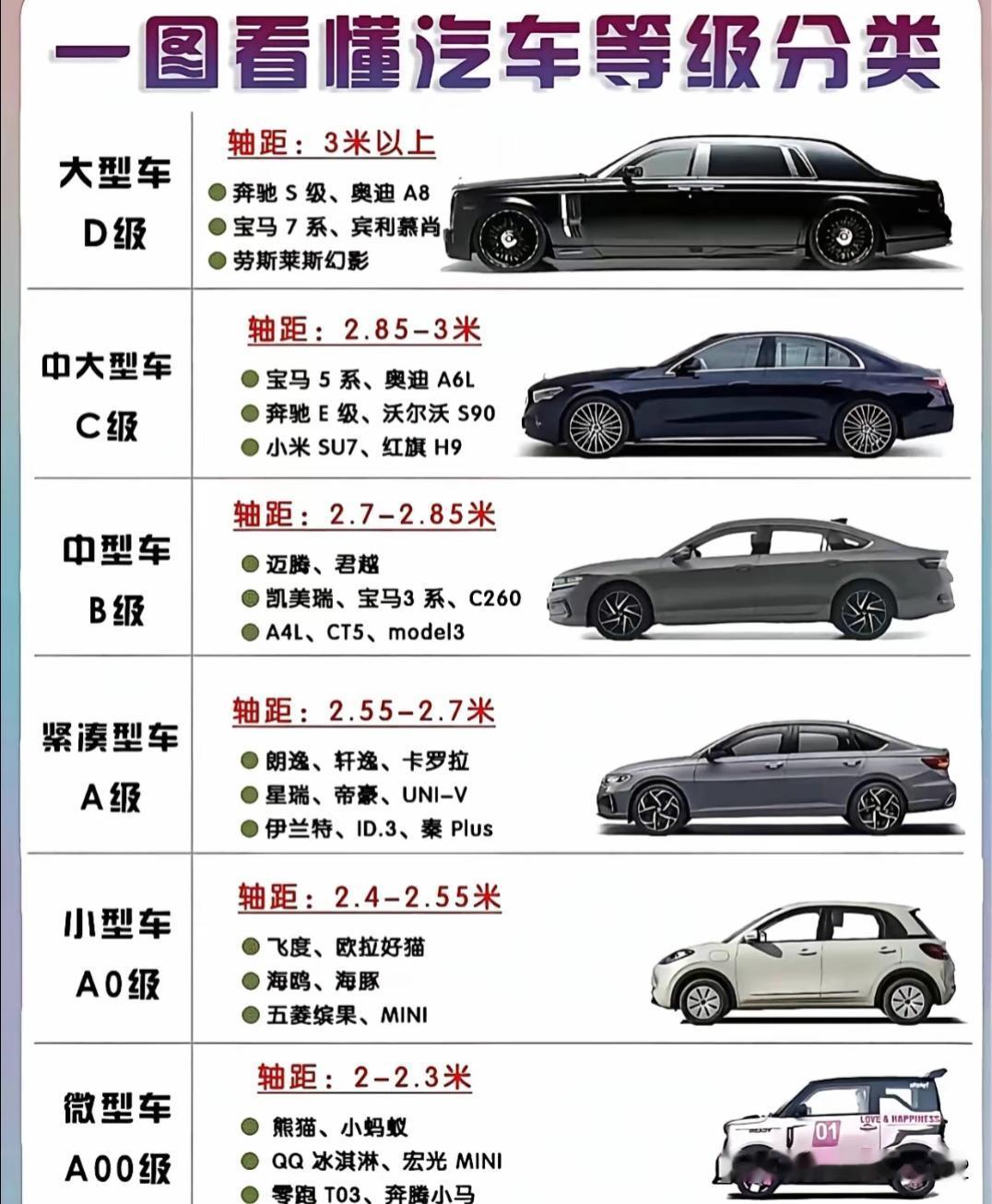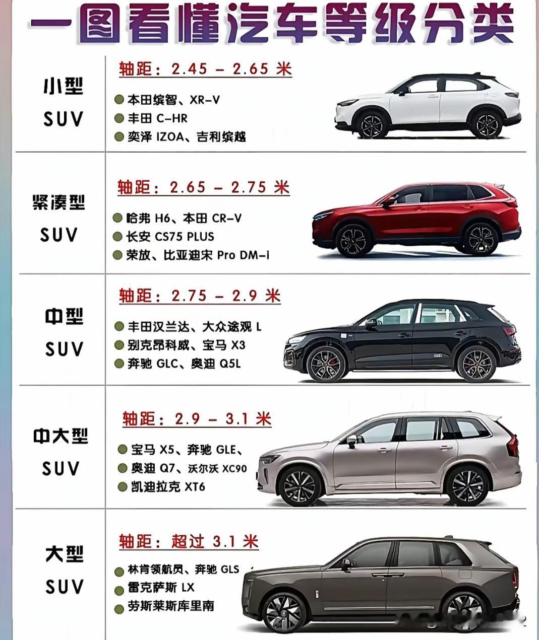 那中间重合的怎么算 ?车长4.7米+ 轴距2.7米的是紧凑型还是中型? 雷克萨斯RX 4.8米 轴距2850 居然定位中大 ?人家CRV是紧凑,那天两个放一起,看起来真的差不多大。 我个人认为车越大越不好看,最小的从紧凑型开始到中大型算是最大的了,这之间的比例刚刚好。