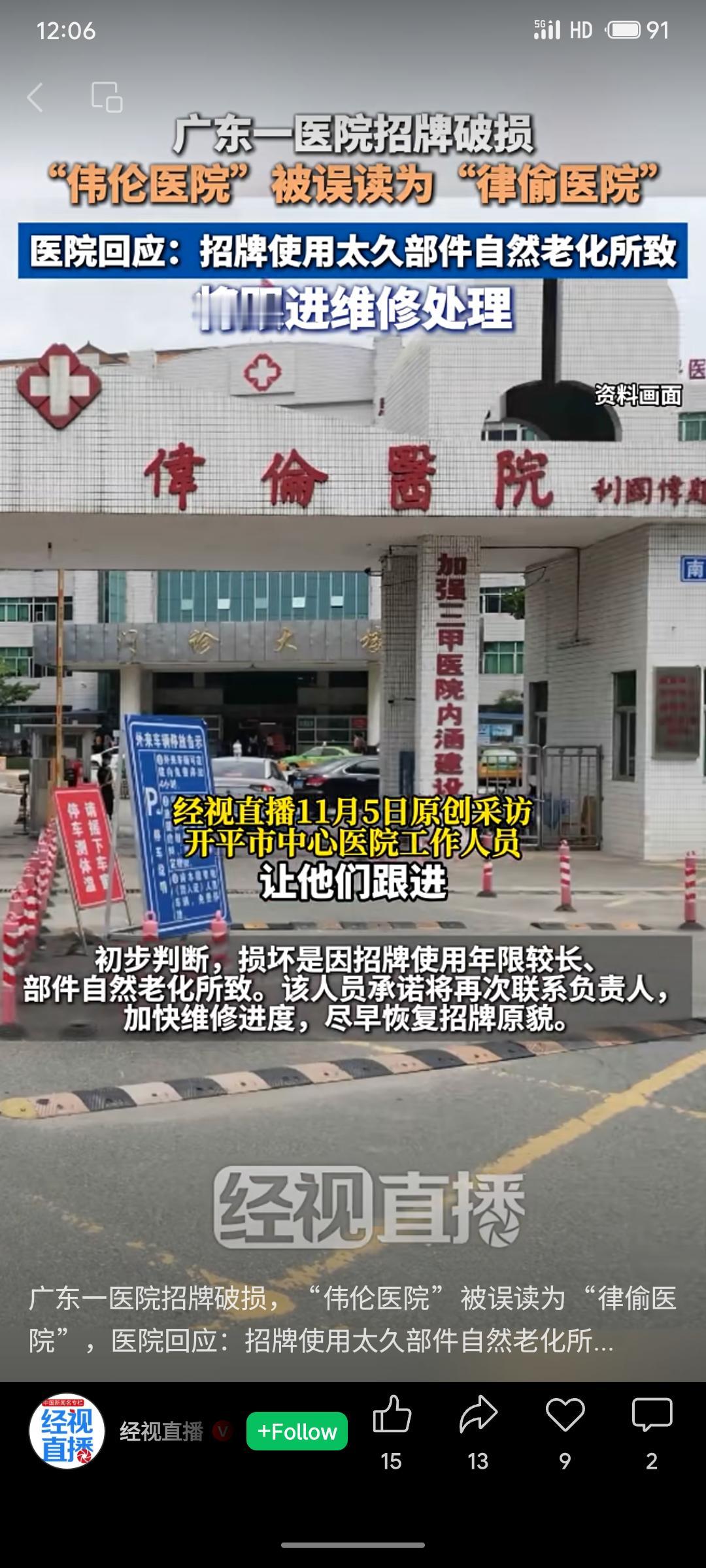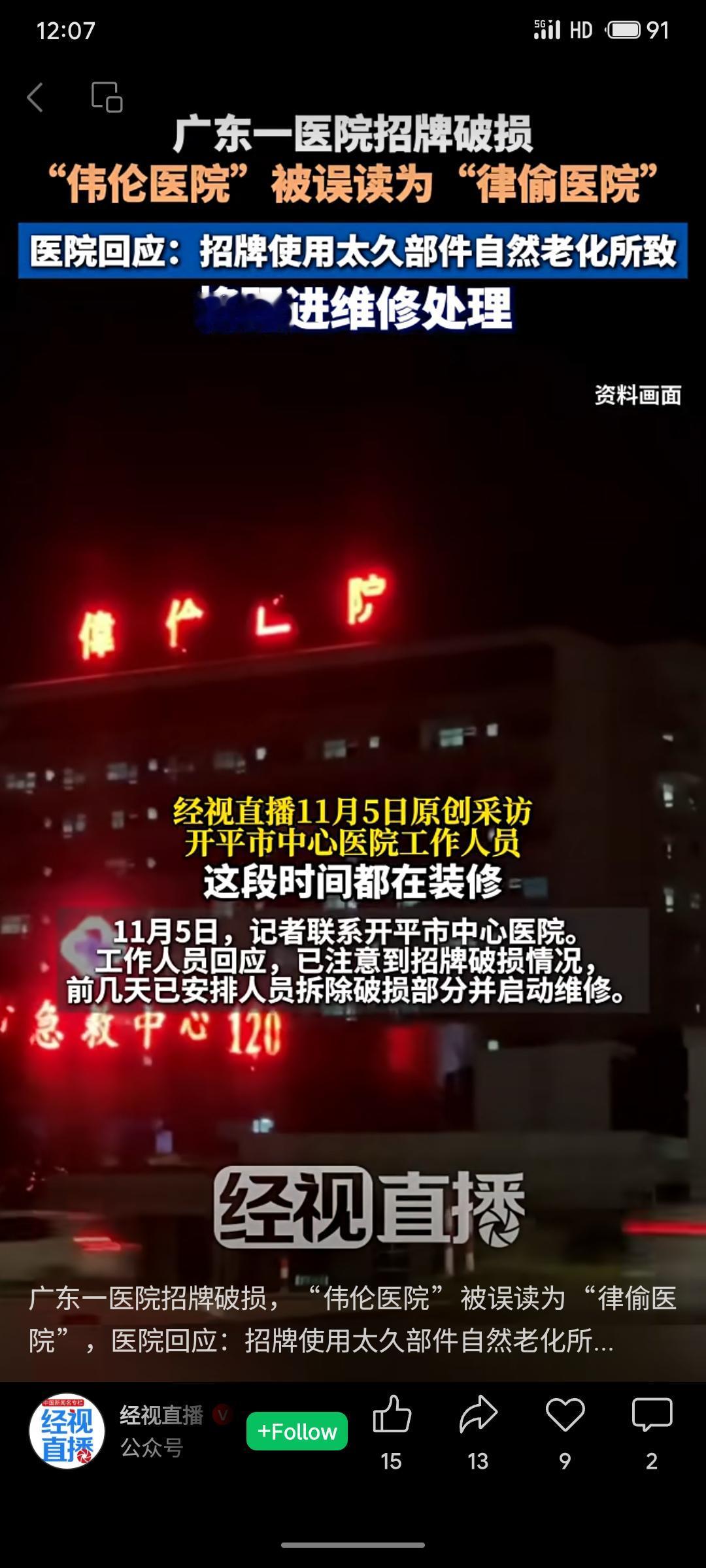 因招牌部件老化破损,广东“伟伦医院”字样被误读为“律偷医院”,引发网络关注。院方回应称已注意到情况,正安排拆除并加快维修,将尽快恢复原貌。