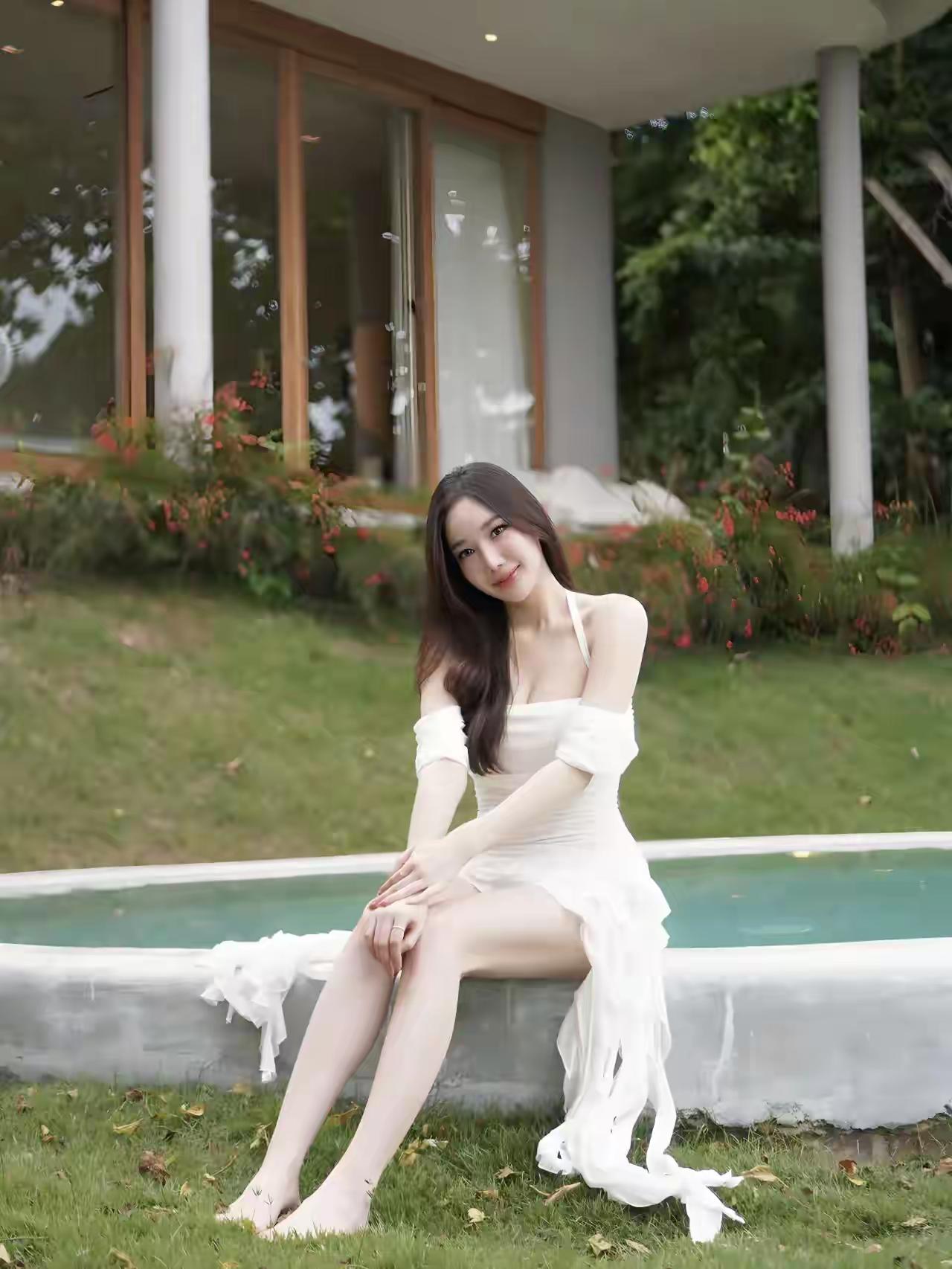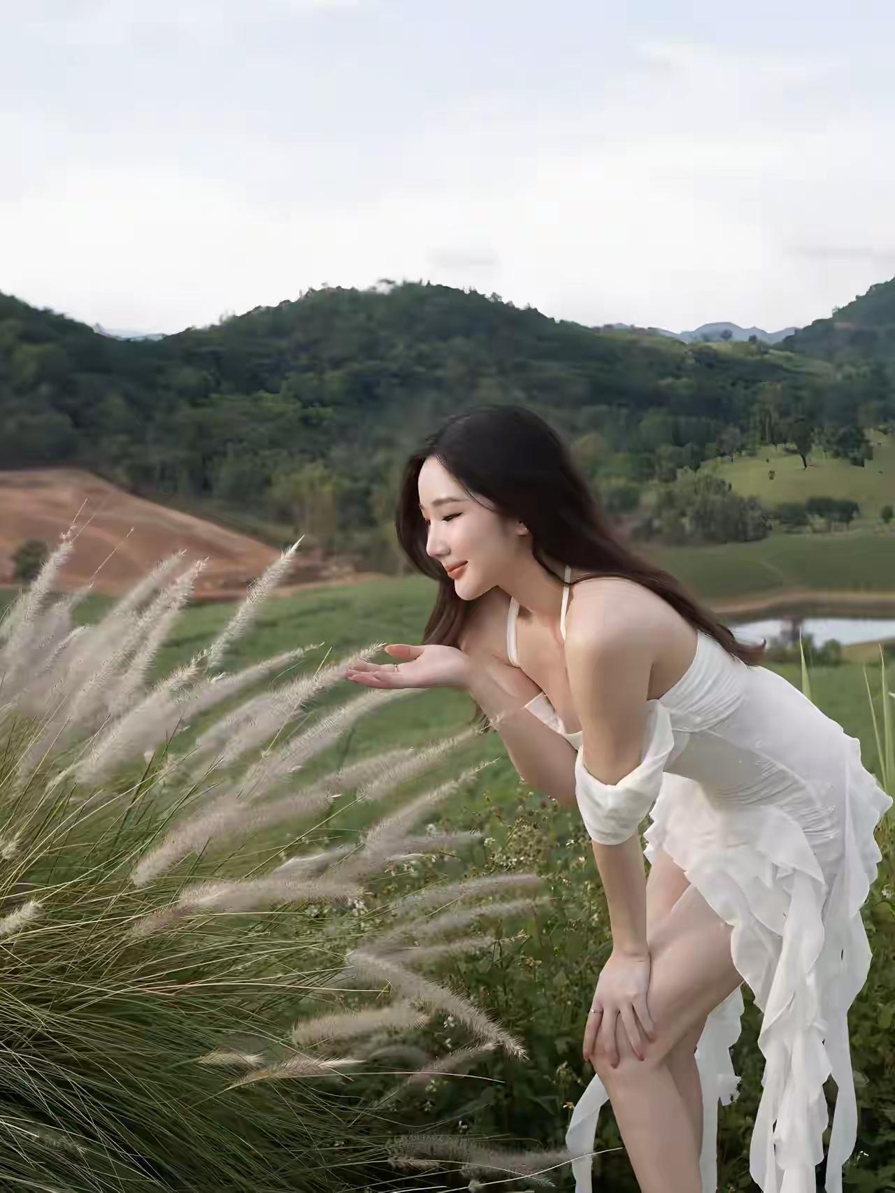 优雅白裙,轻纱飘逸,自然光下,清新脱俗。