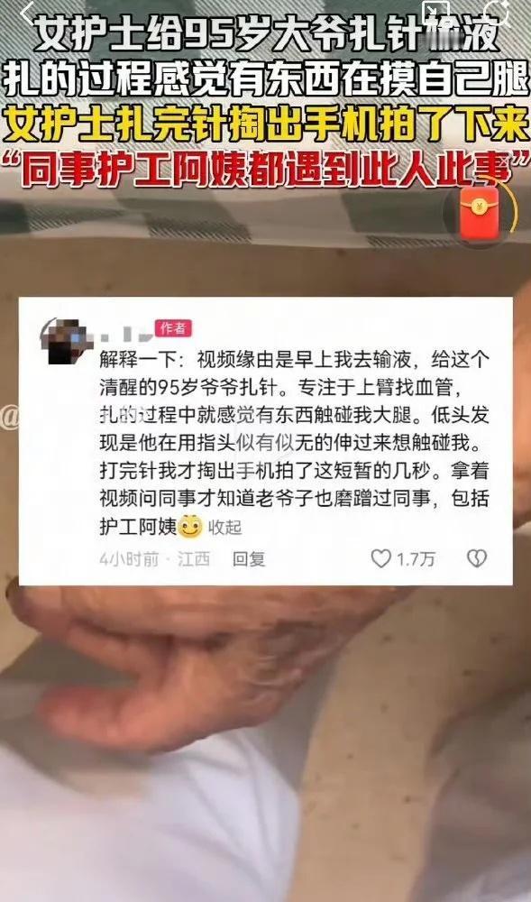 好坏从来不分年龄 女护士称给95岁大爷扎针时被摸腿 年纪从来不是一个人行为的某种标志,认知才是…